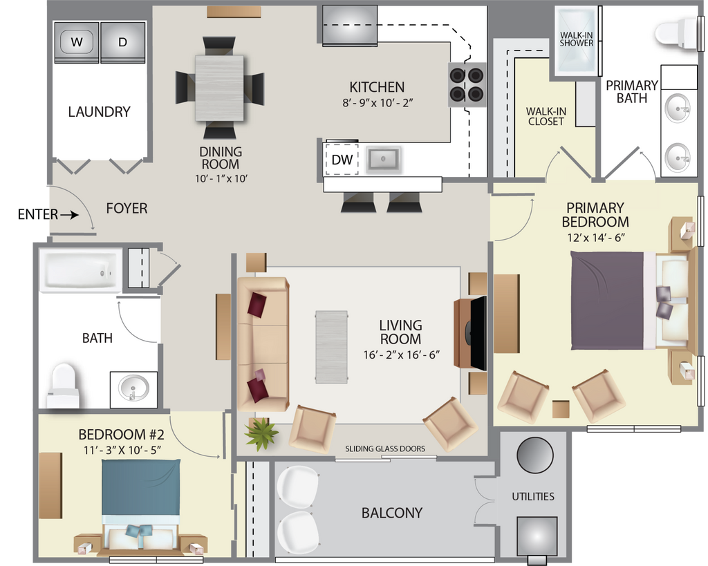 2 Beds, 2 Baths, 1194 sq ftAvailable NowModel Gallery