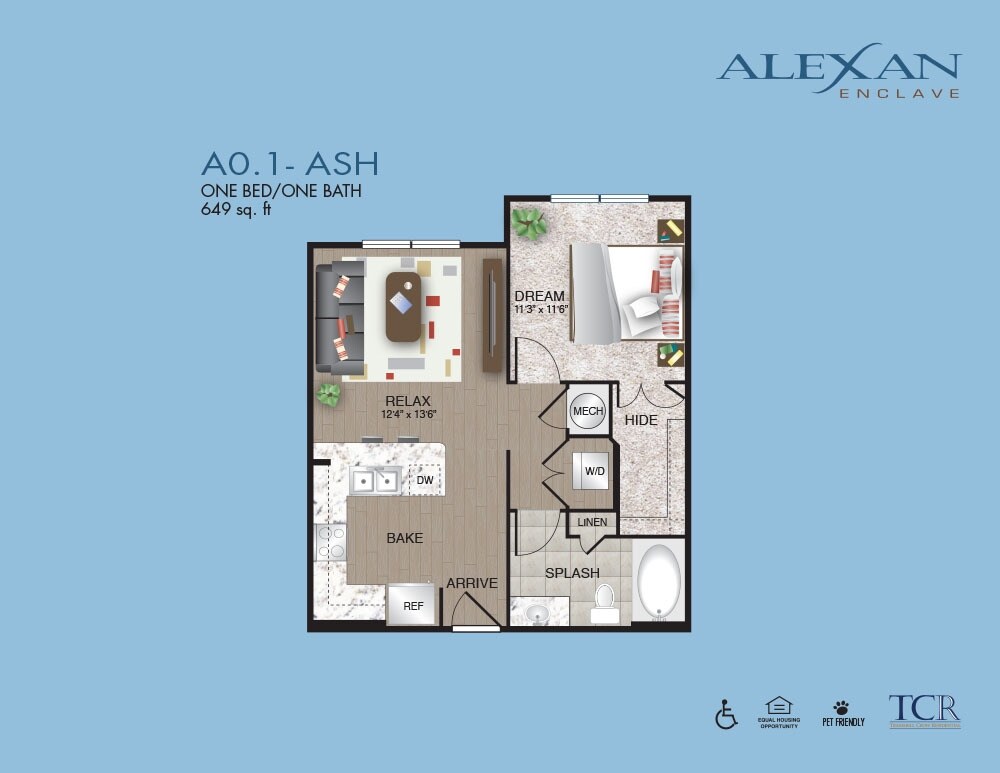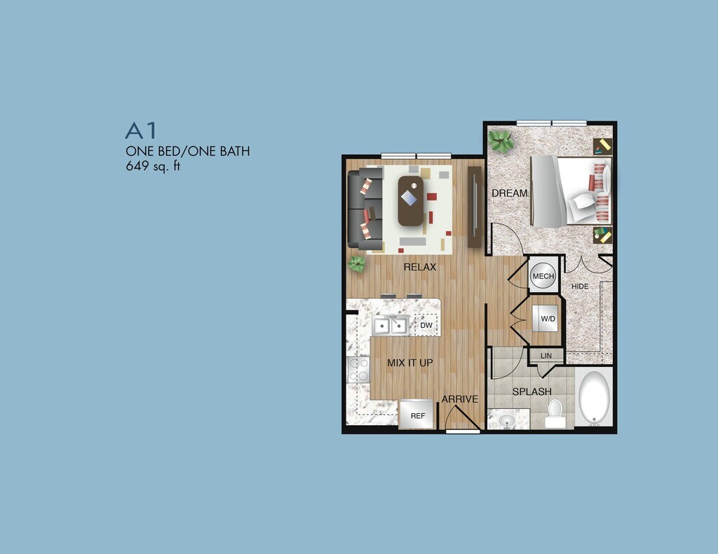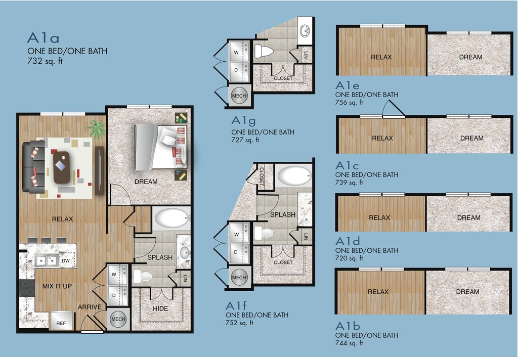 Apartment Model: A1a - A1g1 Bedroom, 1 Bath, 720-756 sq ftAvailable Now![]()