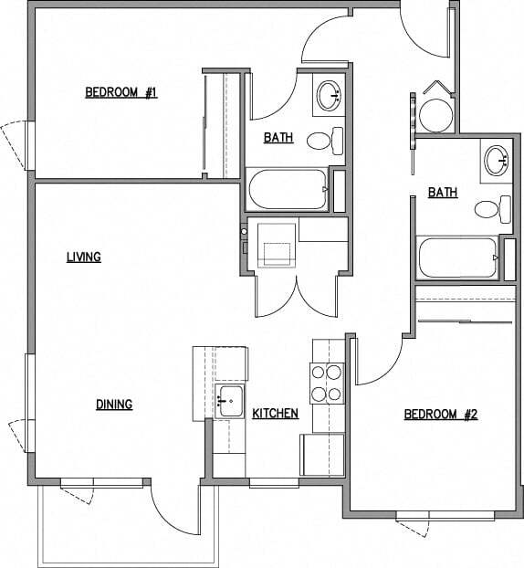 2 Bed 2 Bath B - Floorplan 1 Apartment Unit: 101BApartment Model: 2 Bed 2 Bath B$1,9952 Bedroom, 2 Bath, 885 sq ftAvailable Now2 Bed 1 Bath A