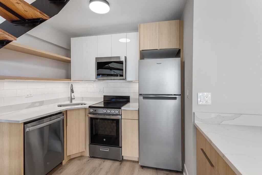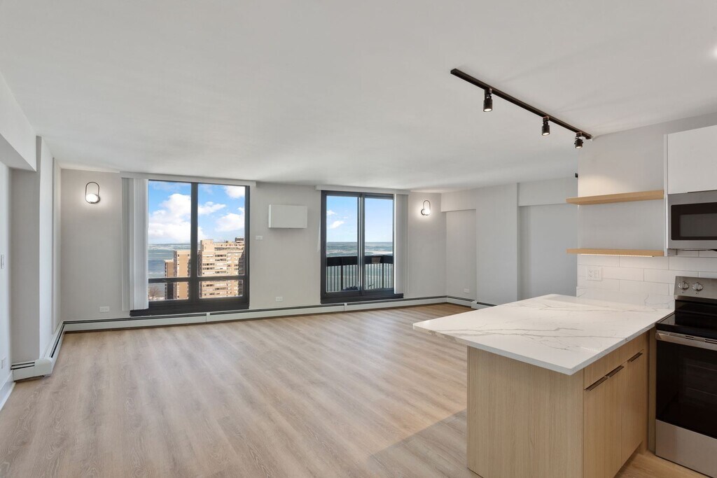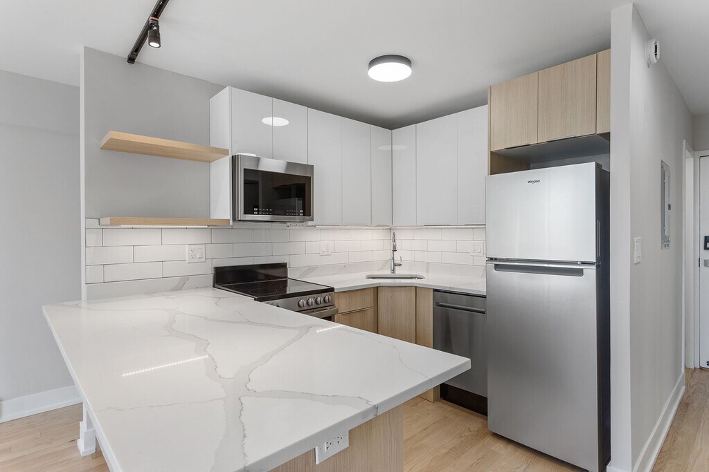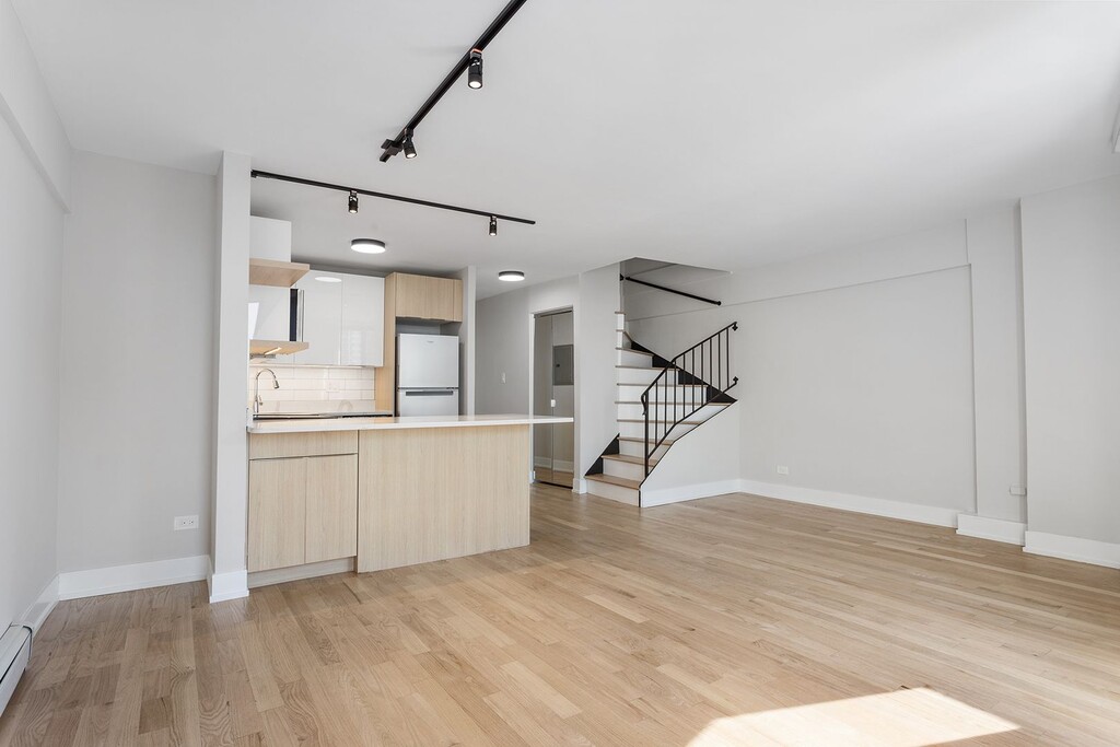 Apartment Features: —Modern Two Toned Kitchen Cabinets with Undercab Lighting —Stainless Appliances including Dishwasher —Lake Views and Floor-to-Ceiling Windows to Take Them In! —Quartz Countertops with Deep Undermount Sink —Duplex Staircase —Upstairs In-Unit Laundry —Powder room and Full Bath —Heat & Water included —Pets welcome (No pet rent!)