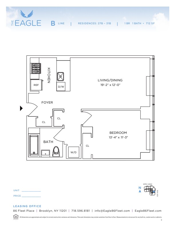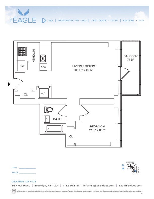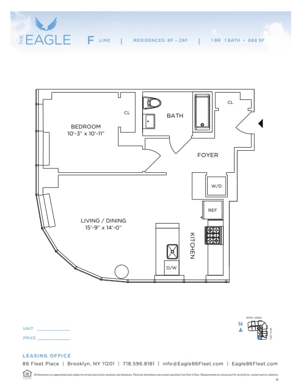 Introducing Brooklyn’s newest luxury residential development – The Eagle. Perfectly located where lively Downtown Brooklyn meets historic Fort Greene. Each residence features floor-to-ceiling windows, walnut floors, spacious closets and an in-unit washer/dryer. The gourmet kitchen features stainless steel appliances, custom oak cabinets and Brazilian stone countertops. Oversized luxurious bathrooms offer soaker tubs and oak vanities with quartzite countertops. Enhance your lifestyle with over 34,000 square feet of incredible amenities, including a state-of-the art fitness center with exercise studio, vast sun deck with cabanas, outdoor barbeque and herb garden, private dog run, lush rooftop garden offering expansive NYC views, business center, tenant lounge, and party room. The Eagle offers a 24-hour concierge, full-service valet, in-building storage, bike room and an on-site parking garage. The Eagle’s dynamic location offers a cosmopolitan mix of culture, entertainment and recreation. Residents will enjoy the convenience of high-end retail, Fort Greene Park, year-round farmers’ markets, gourmet coffee shops and one of the City’s most vibrant restaurant scenes.
