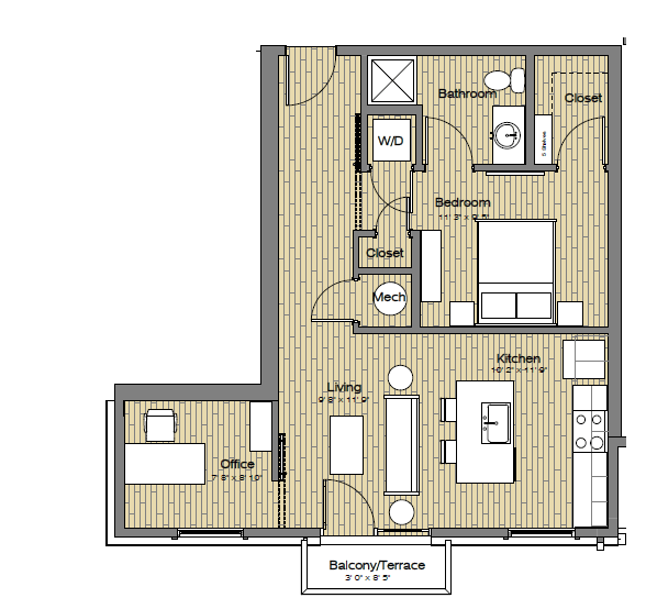 S2 Studio / One Bath w/Office - Floorplan 2 1 Bedroom