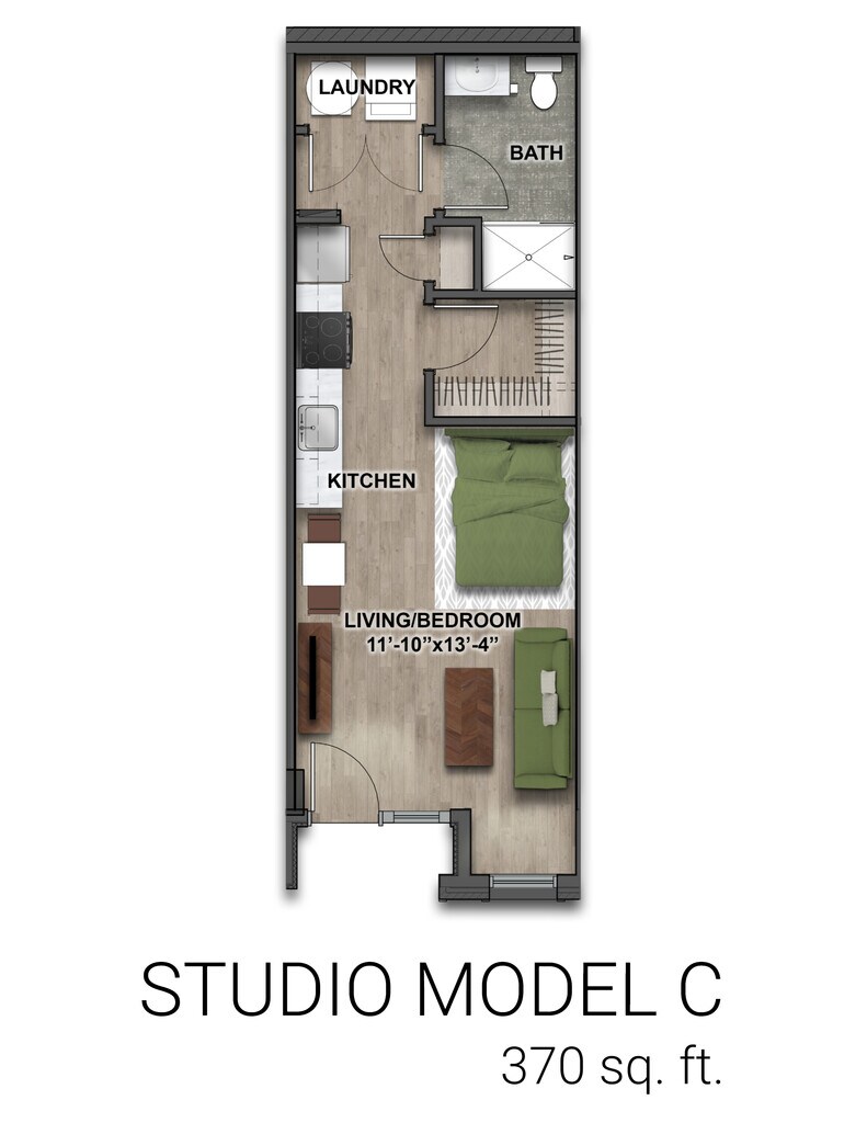 Apartment Model: Studio - Model C$1,350Studio, 1 Bath, 370 sq ftAvailableFloorplansPhotos![]()