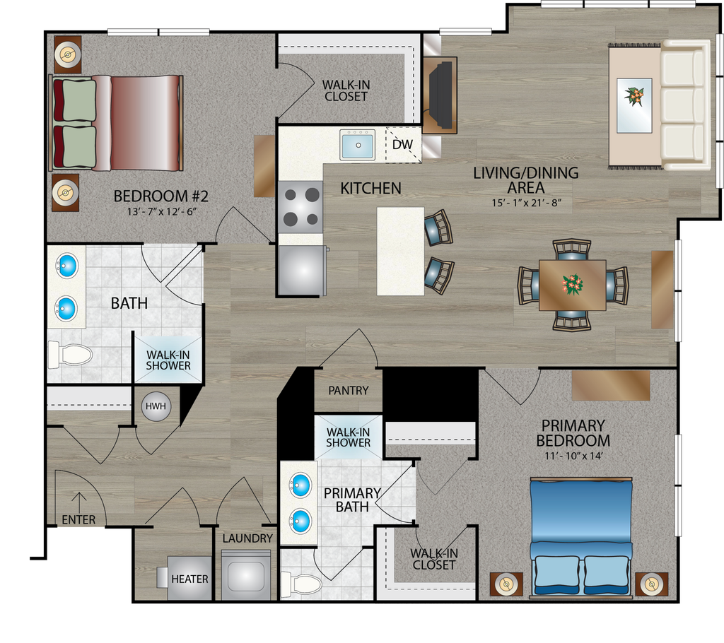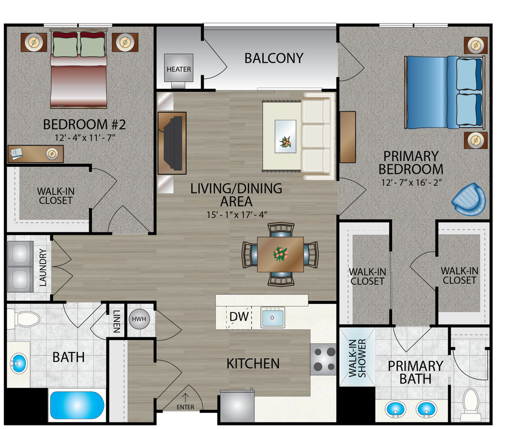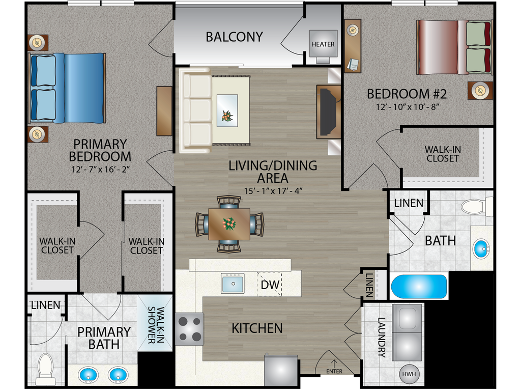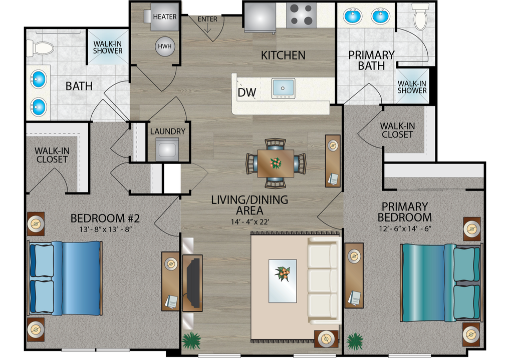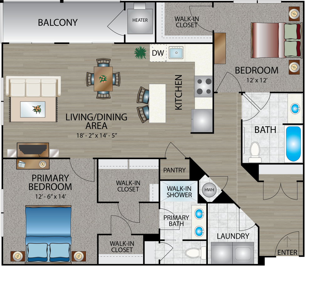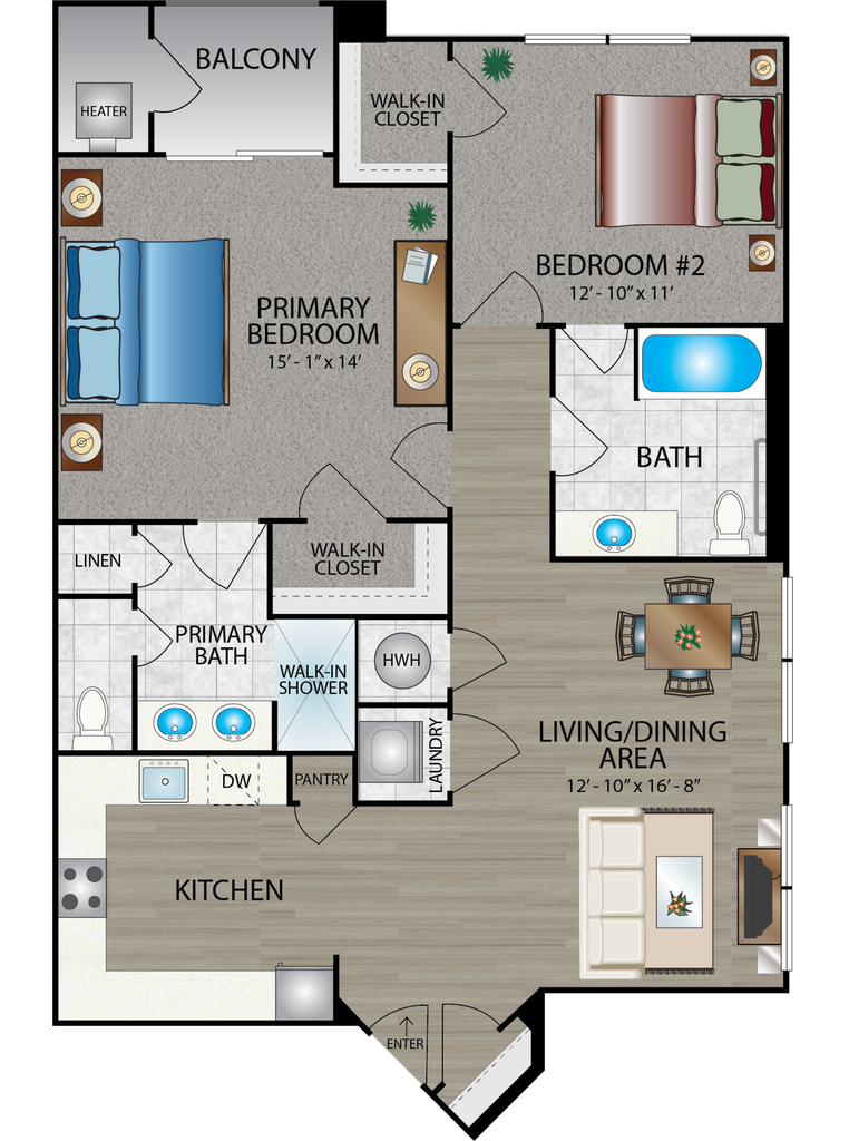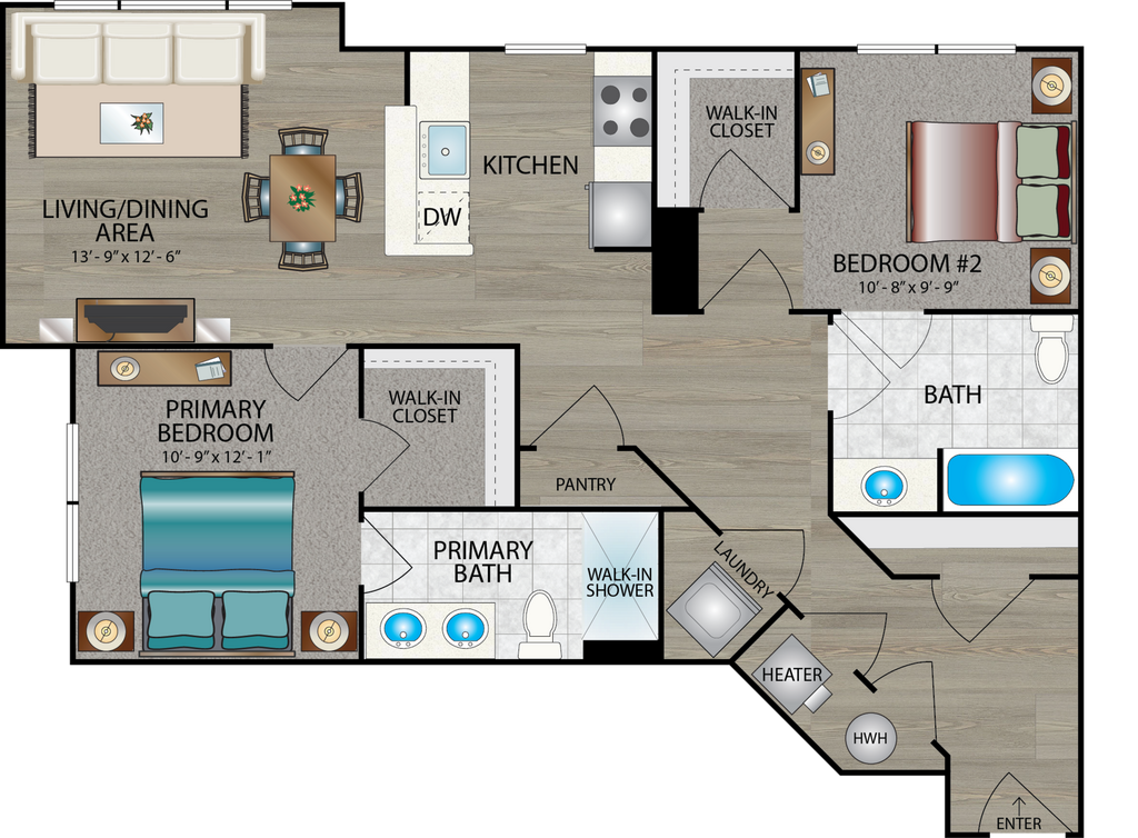 2 Beds, 2 Baths, 1233 sq ftAvailable NowModel Gallery