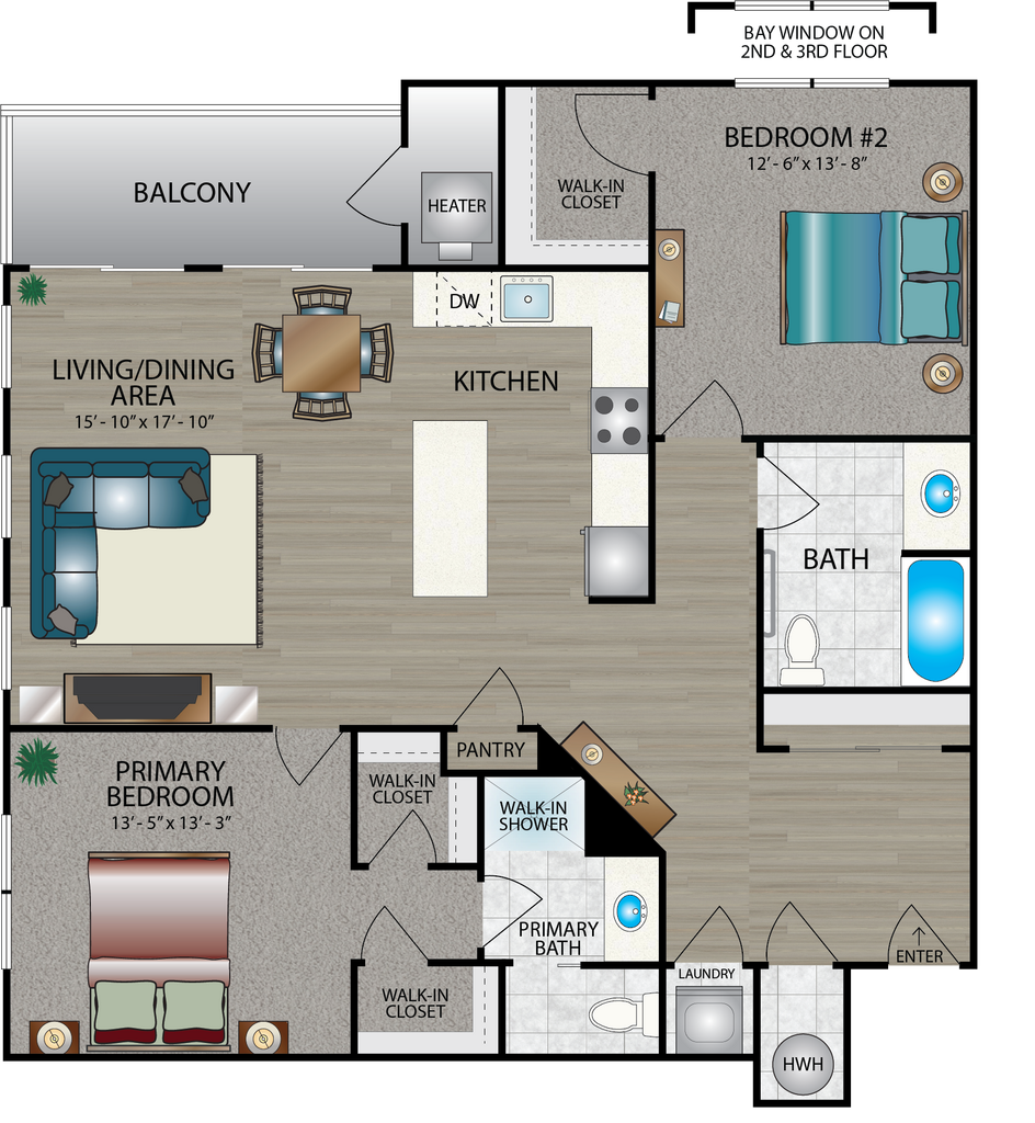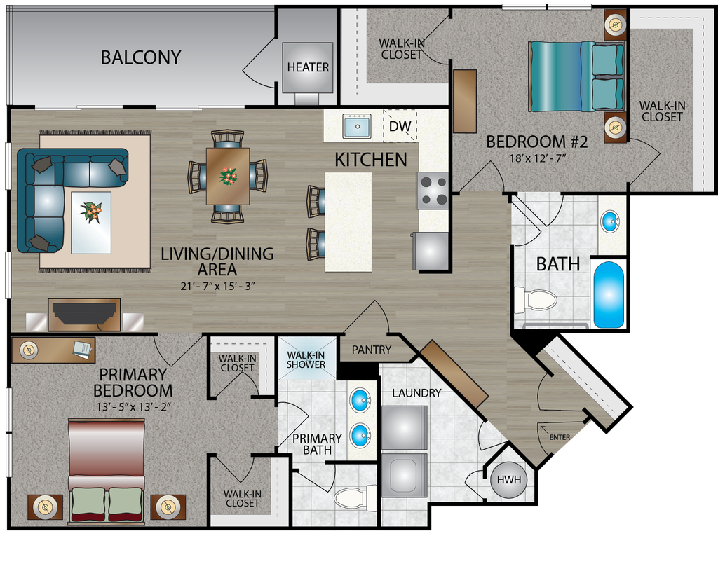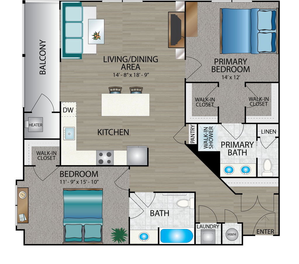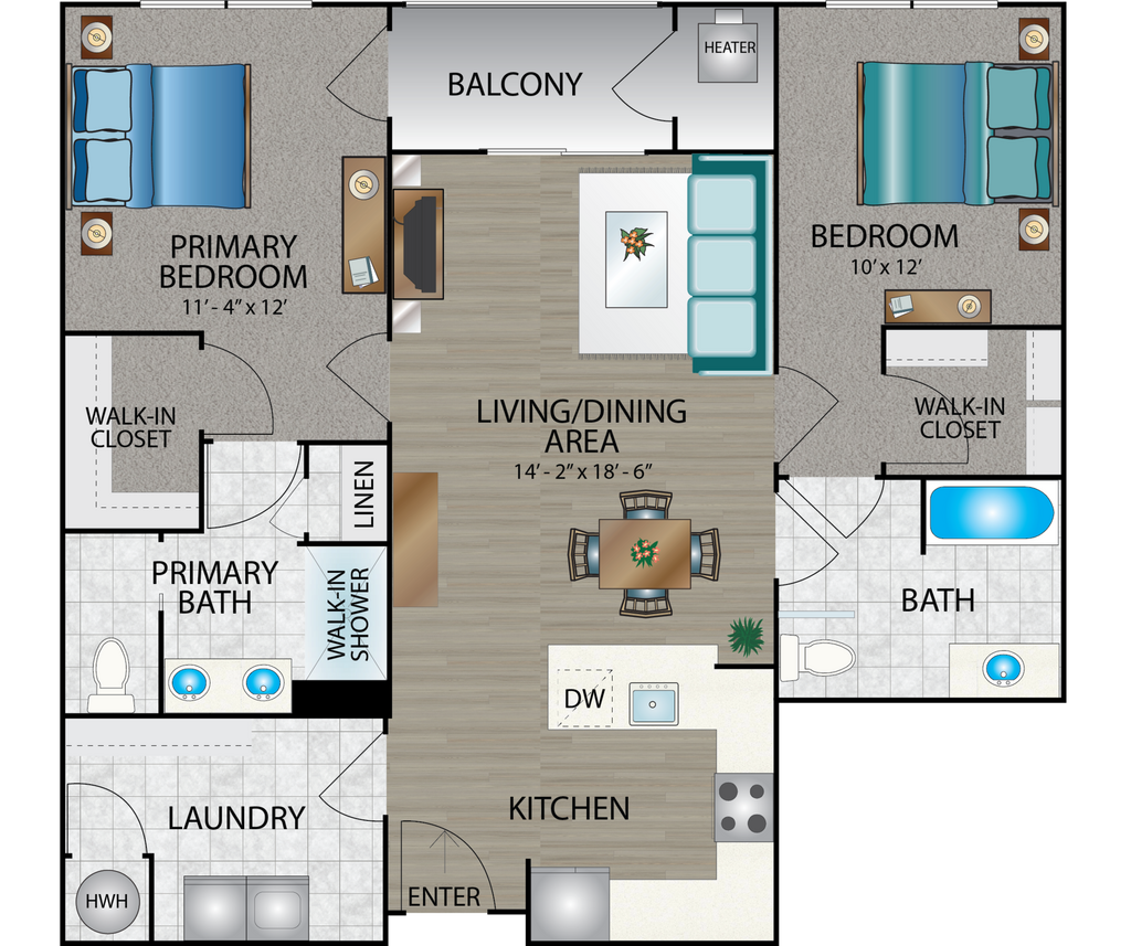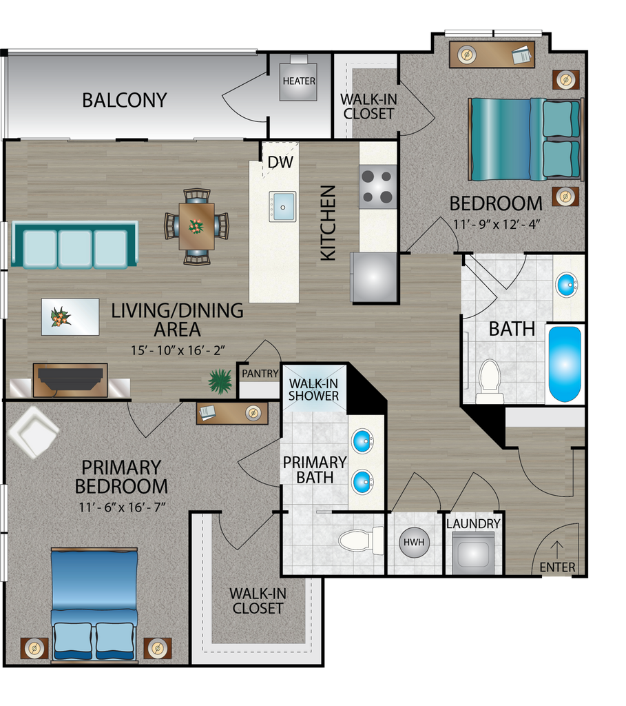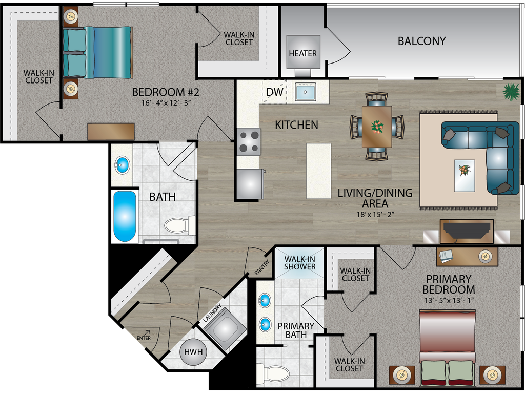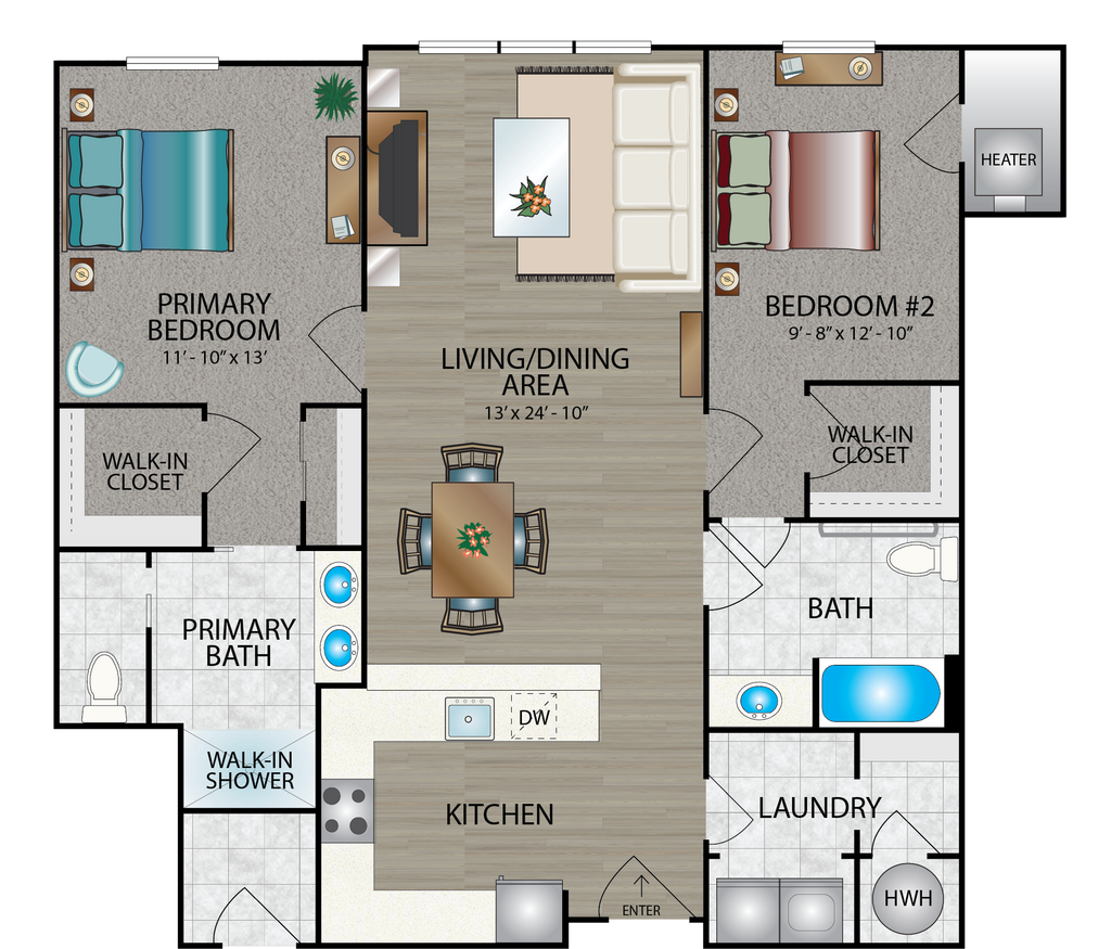 2 Beds, 2 Baths, 1233 sq ftAvailable NowModel Gallery