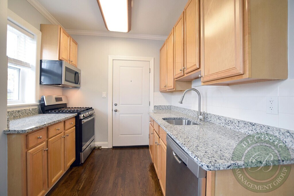 Apartment Features: —Modern Espresso Kitchen Cabinets —Granite Counter tops with Deep Under-mount Sink —Stainless Steel Appliances including Dishwasher —Renovated Bathroom —Central Air Heat/AC —Spacious Living Room with Top Floor Courtyard View —Dark Wood flooring —Ceiling Fans with LED lighting —High Ceilings —Water Included —Pets Welcome (No Pet Rent)