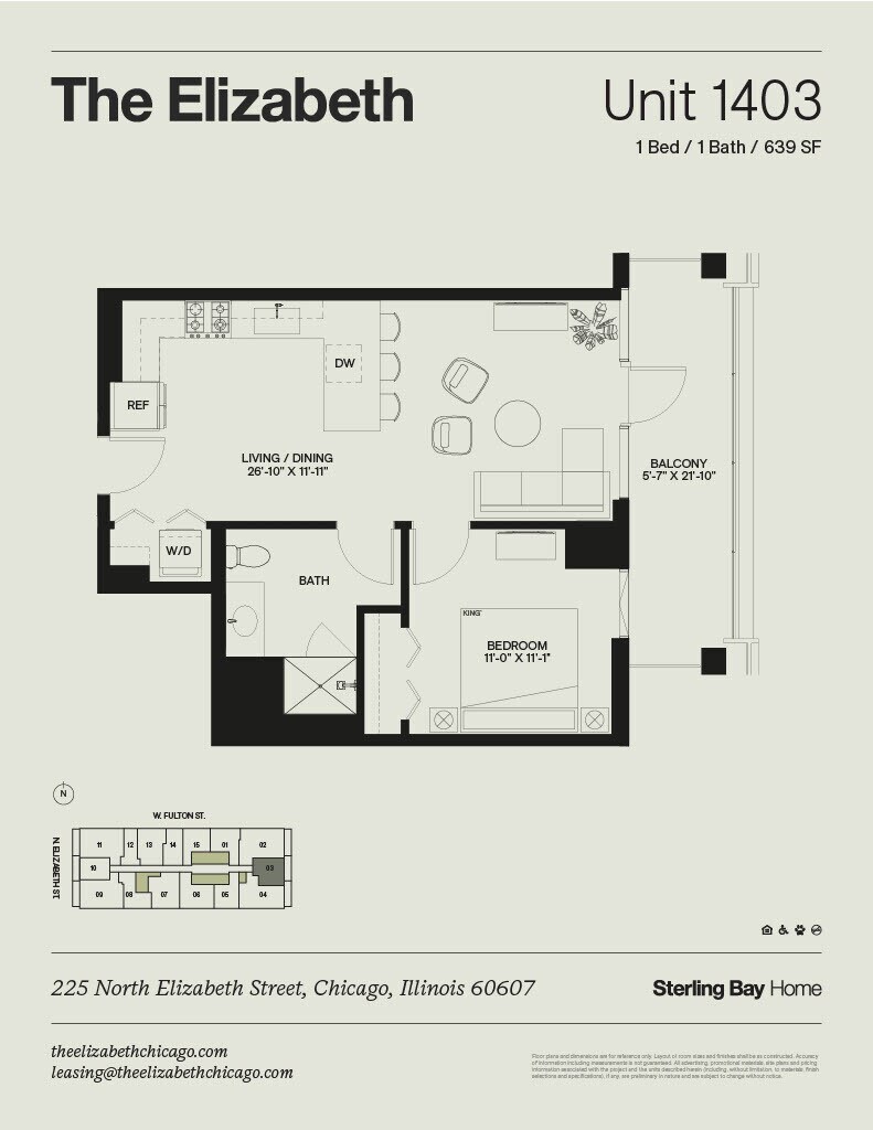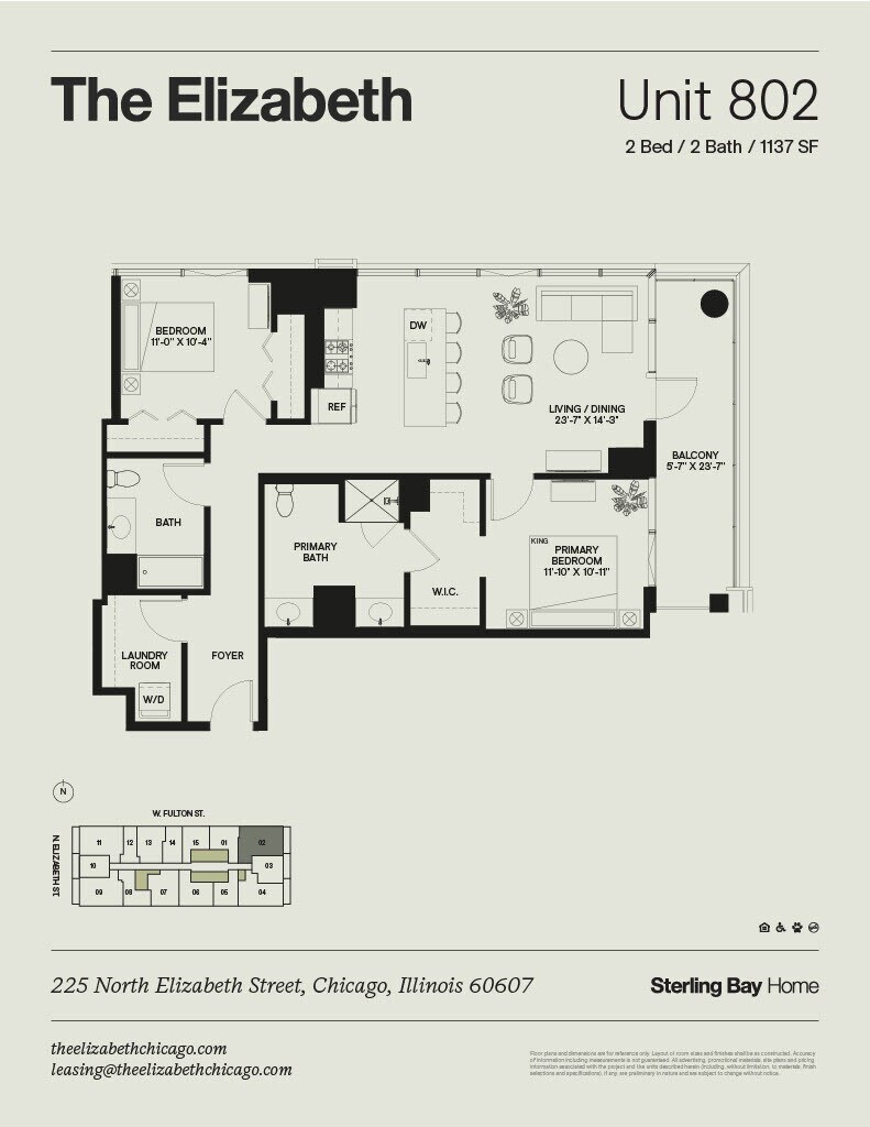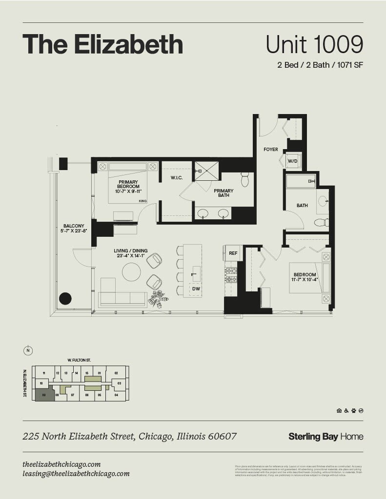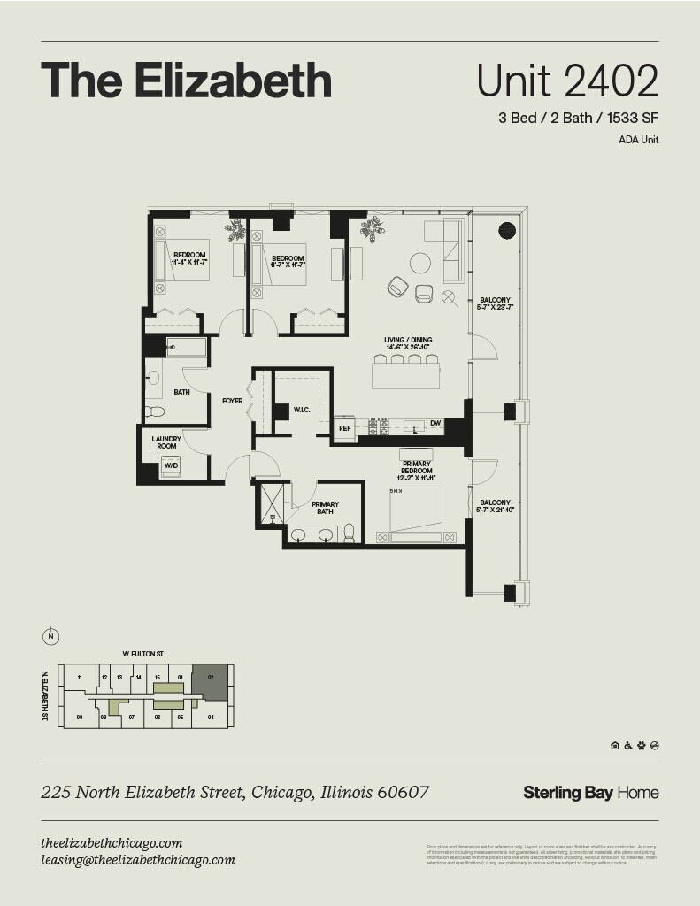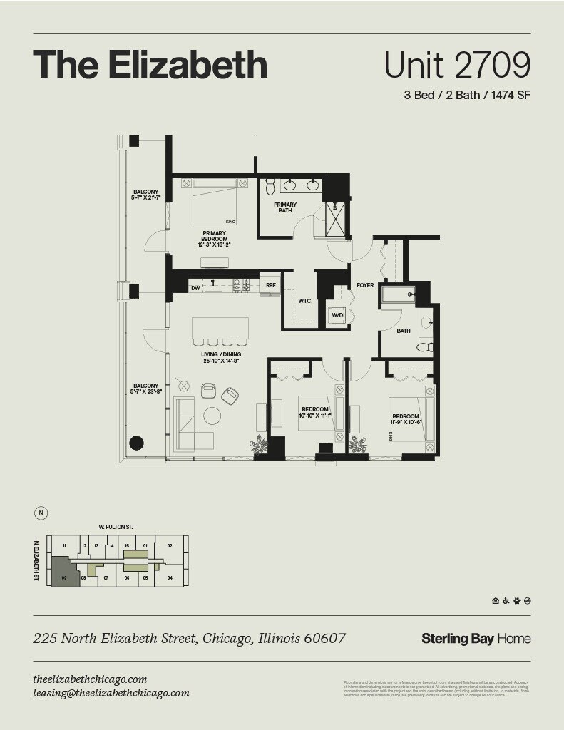The Elizabeth Chicago offers 1 to 3 Bedroom apartments starting from $2,795 and having 586–1,533 sq ft. Here is the current pricing and availability: