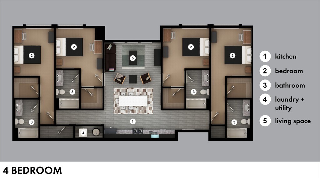 4A - Floorplan 1 Apartment Unit: PrivateApartment Model: 4A4 Bedroom, 4 Bath, 1616 sq ftAvailable NowApartment Unit: PrivateApartment Model: 4A4 Bedroom, 4 Bath, 1616 sq ftAvailable August 15, 20264 Bedroom Corner - C