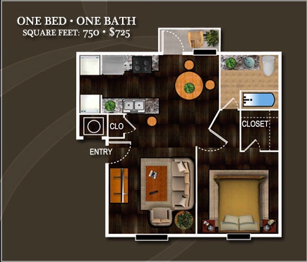 Apartment Model: 1 Bedroom$9001 Bedroom, 1 Bath, 750 sq ftUnavailable![]()
