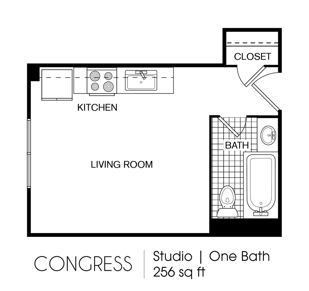 Congress Studio 256 - Floorplan 1 Apartment Unit: 1-0511Apartment Model: Congress Studio 256$785Studio, 1 Bath, 256 sq ftAvailable NowApartment Unit: 1-0211Apartment Model: Congress Studio 256$844Studio, 1 Bath, 256 sq ftAvailable NowApartment Unit: 1-1211Apartment Model: Congress Studio 256$899Studio, 1 Bath, 256 sq ftAvailable NowCongress Studio 300