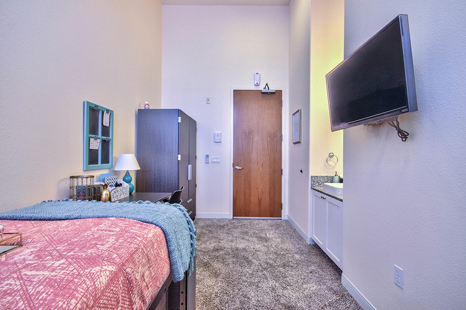 Located just steps away from the campus of San Diego State University, The Suites on Paseo is a brand new off campus up-scale Housing Community that offers Individual Leases. The Suites on Paseo offers residents a unique living environment that is all inclusive. Rates include all utilities and housekeeping services. Amenities included in rent are on site 90" movie theater with gaming consoles, 24-hour Crossfit gym, luxury spray tanning facilities, and the Brick Oven Bistro restaurant. Onsite laundry, meal plans, and covered parking available.