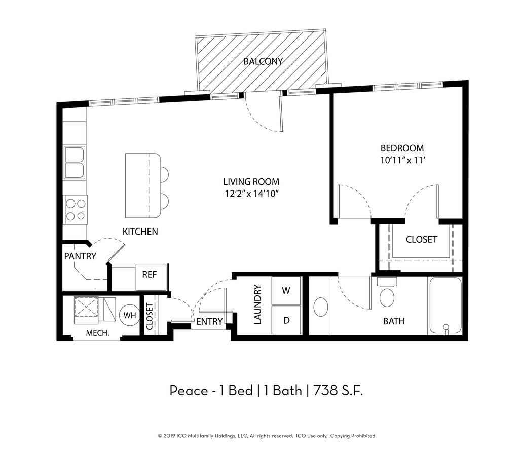 Availability Date Unit Sq Ft Unavailable The Peace 1x1 738 sq ft Apartment Model: The Peace 1x11 Bedroom, 1 Bath, 738 sq ftUnavailableFloorplansPhotos![]()