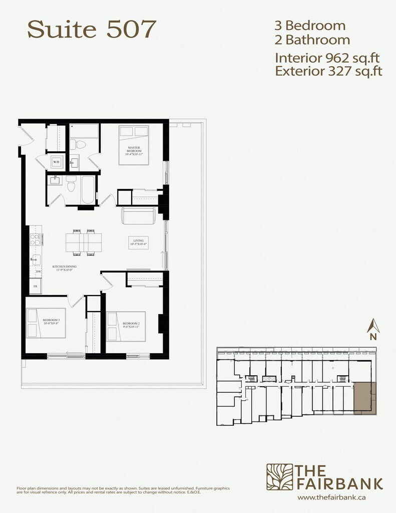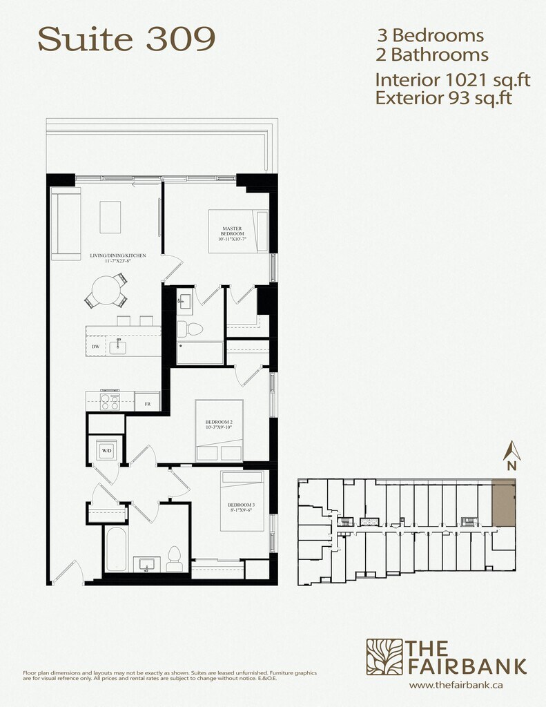 The Fairbank offers Studio to 3 Bedroom apartments starting from $2,099 and having 460–1,035 sq ft. Here is the current pricing and availability: