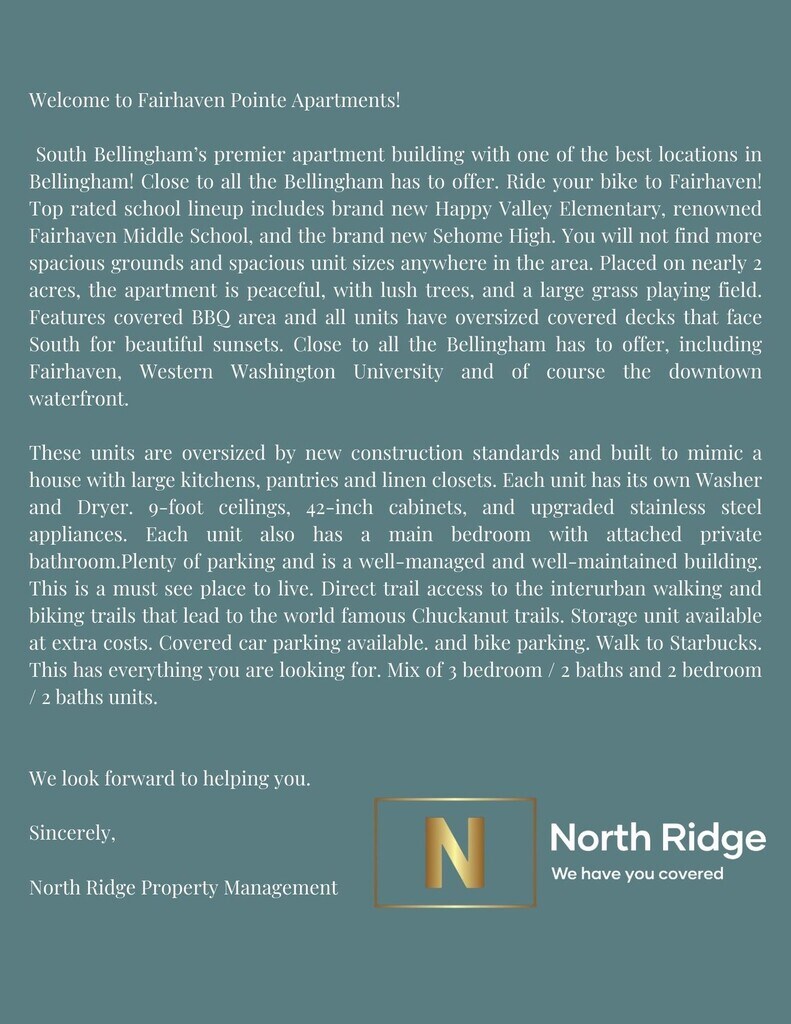 Welcome to Fairhaven Pointe Apartments. South Bellingham’s premier apartment building with one of the best locations in Bellingham! Close to all the Bellingham has to offer. Ride your bike to Fairhaven! Top rated school lineup includes brand new Happy Valley Elementary, renowned Fairhaven Middle School, and the brand new Sehome High. You will not find more spacious grounds and spacious unit sizes anywhere in the area. Placed on nearly 2 acres, the apartment is peaceful, with lush trees, and a large grass playing field. Features covered BBQ area and all units have oversized covered decks that face South for beautiful sunsets. Close to all the Bellingham has to offer, including Fairhaven, Western Washington University and of course the downtown waterfront. These units are oversized by new construction standards and built to mimic a house with large kitchens, pantries and linen closets. Each unit has its own Washer and Dryer. 9-foot ceilings, 42-inch cabinets, and upgraded stainless steel appliances. Plenty of parking and is a well-managed and well-maintained building. This is a must see place to live. Direct trail access to the interurban walking and biking trails that lead to the world famous Chuckanut trails. Storage unit available at extra costs. Covered car parking available. and bike parking. Walk to Starbucks. This has everything you are looking for. Mix of 3 Beds/2 Baths and 2 Beds/2 Baths units.