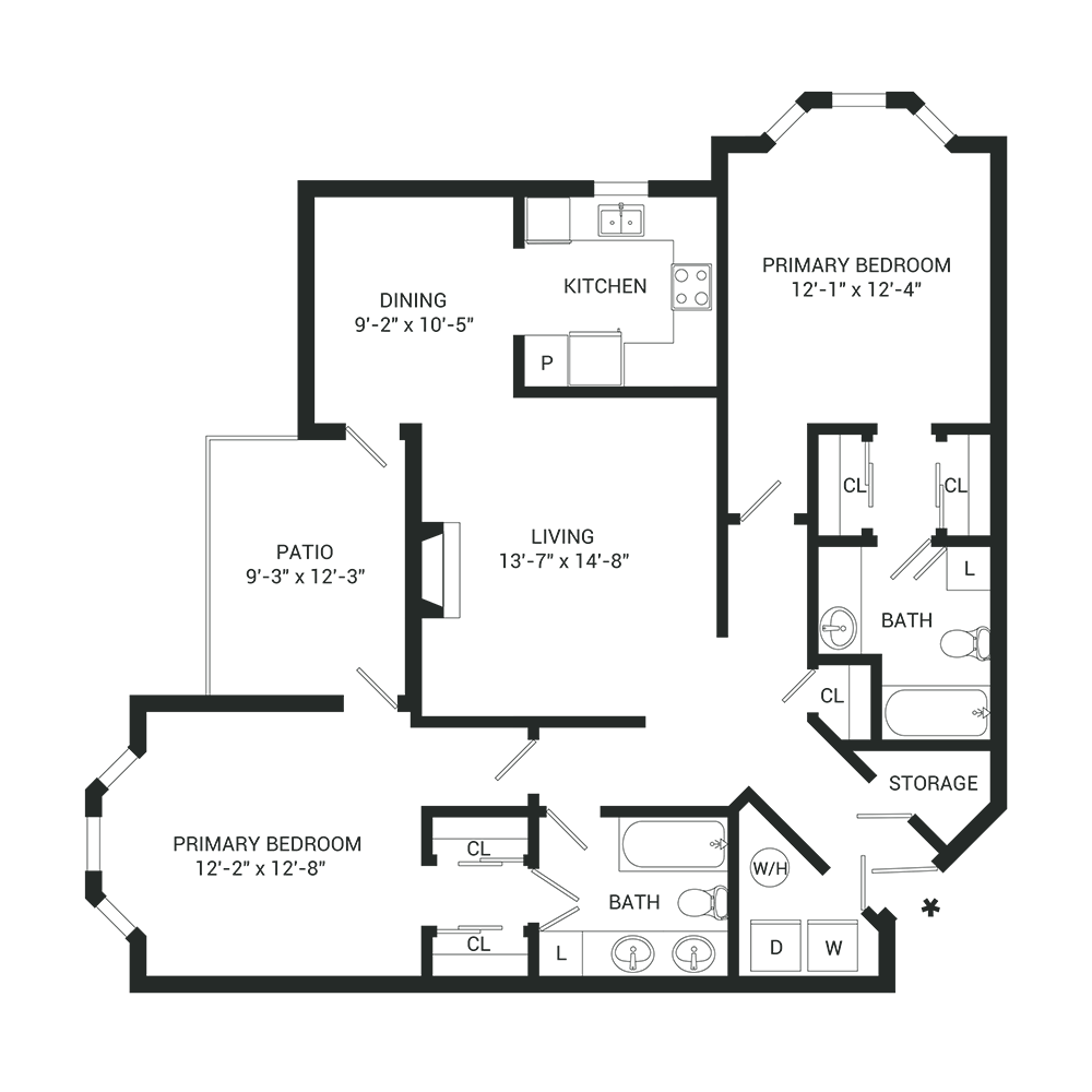 Apartment Model: B12 Bedroom, 2 Bath, 1209 sq ftAvailable March 9, 2026Floor plans are artist's rendering. All dimensions are approximate. Actual product and specifications may vary in dimension or detail. Not all features are available in every rental home. Please see a representative for details.