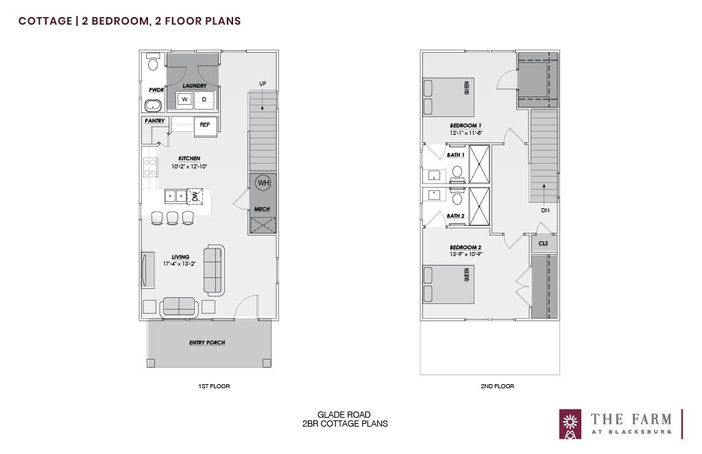If you seek refuge from the typical college town community, welcome to The Farm at Blacksburg. The Farm offers three distinct living opportunities, which blend together to create a unique, thriving community with only 115 bedrooms. Select from a variety of detached cottages, multi-level townhomes and spacious apartments. All offer porch living, multiple floorplans and the modern conveniences, technologies, and design features to suit your needs: Common Design Features 9-foot ceilings Quartz and Granite Countertops Tile backsplashes Designer Kitchens with Stainless Steel Appliances LVT Wood Plank Flooring Programmable Door Locks Pet Friendly Units with Porches, Decks, Balconies Designer Finishes
