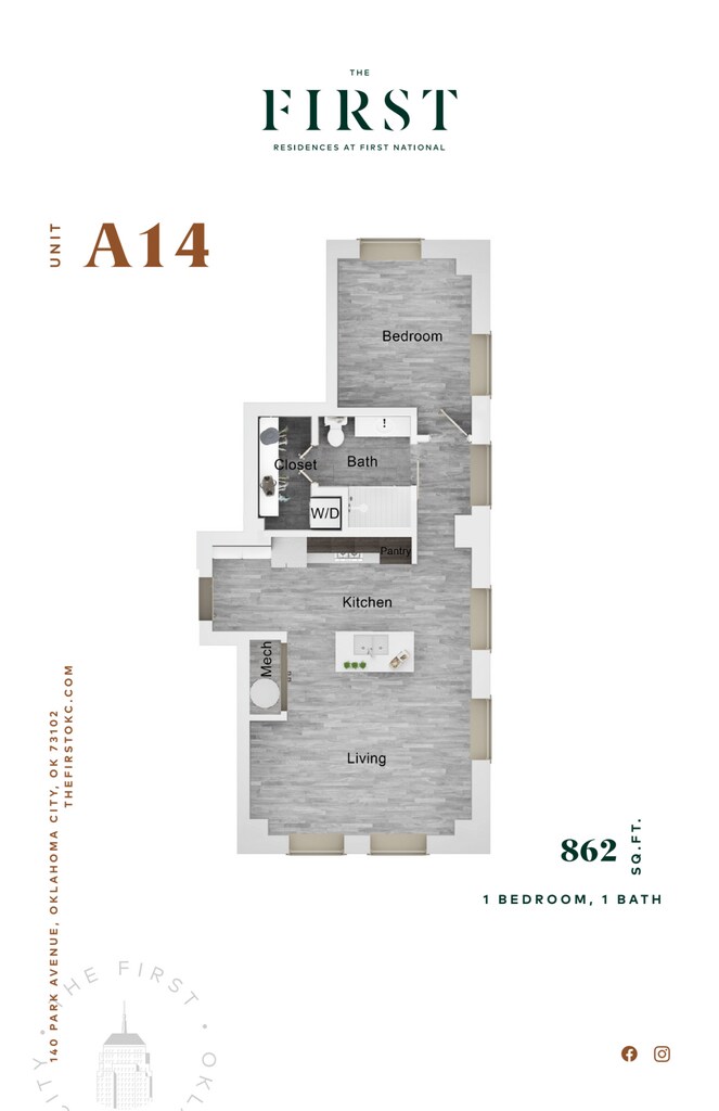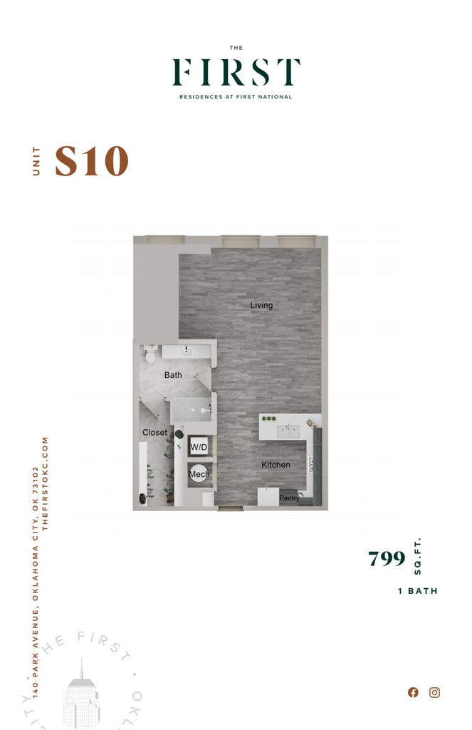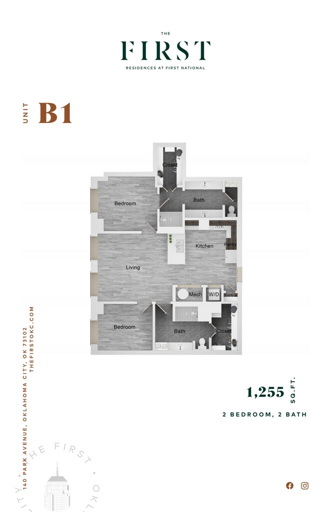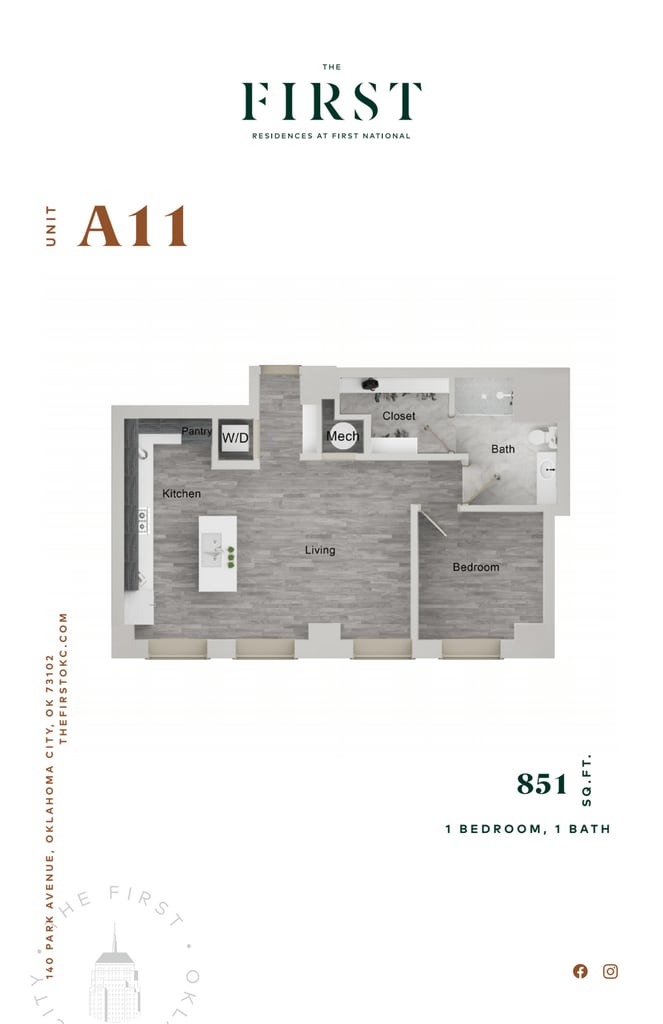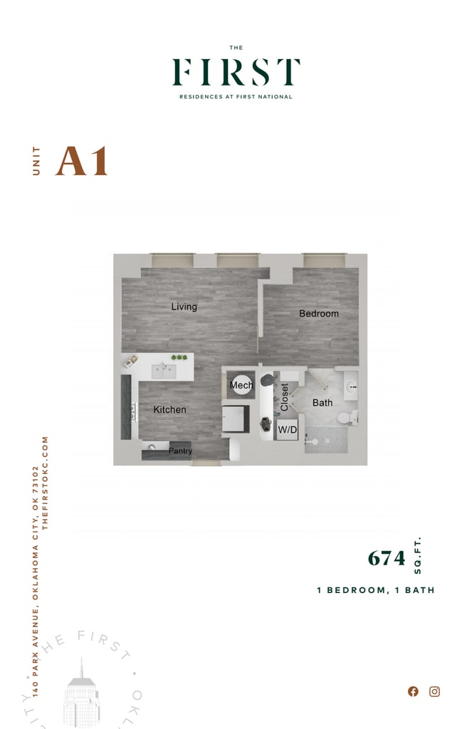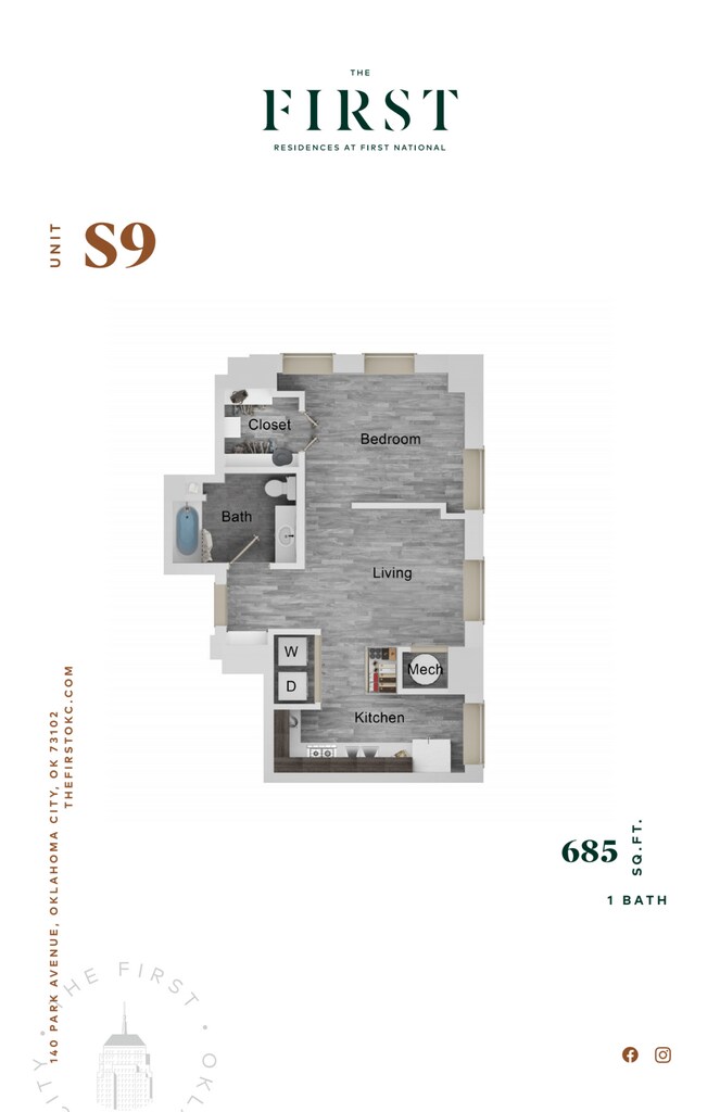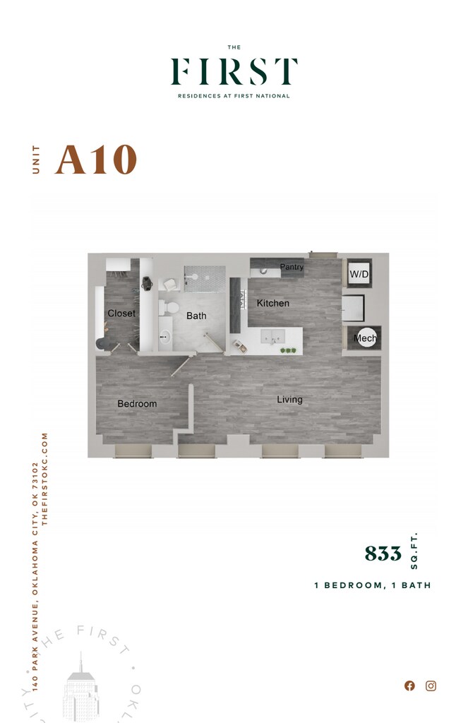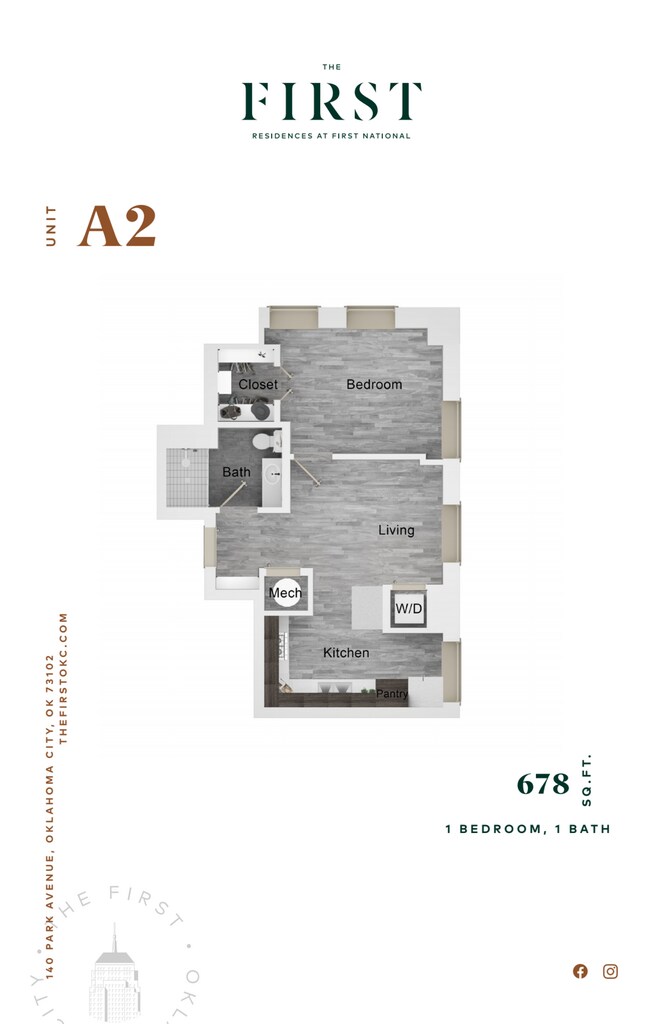 The perfect living experience does exist at The First Residences in Oklahoma City, OK, where premium community amenities, spacious floorplans, and stylish interiors collide. At The First, we know how important comfort and convenience is to our residents. Our apartments are fit for every lifestyle, thanks to our spacious one- and two-bedroom units, studios, and penthouse floorplan options. From our resident-side amenity deck to the more than 1 million square feet of community and living space, The First brings history and luxury to life. Built upon luxury and sophistication, The First Residences are unlike any other apartments for rent in Oklahoma City. Art, history, and elegance combine to create an iconic living space in the heart of downtown. Articulately located within the First National Center, our opulent apartment homes are tied to the area’s rich history. Community Amenities: State-of-the-art fitness center, virtual fitness center, luxury hotel rooms for visitors, meeting rooms, gourmet restaurants, upscale bars, 14-story parking garage, high end shopping experiences, rooftop amenity deck with bark parks and seating, rooftop amenity deck with heated infinity pool*, cabanas, and outdoor kitchen, cyber lounge, social lounge, dog wash salon, valet & concierge services, short-term housing available, corporate housing available Residential Amenities: Over 1 million square feet of space, original marble in the front entry doors, spacious customizable walk-in closets, backlit LED vanity mirrors, latch keyless entry system, soft close cabinet doors and drawers, soft close toilet seats, dual climate control*, striking skyline views, roller shades ceiling fans in living room and bedroom(s), ceramic wood plank flooring, gourmet kitchen appliances, designer faucets, under mounted cabinet lighting, full size washer and dryer, stainless steel french door refrigerators, spa inspired walk-in showers