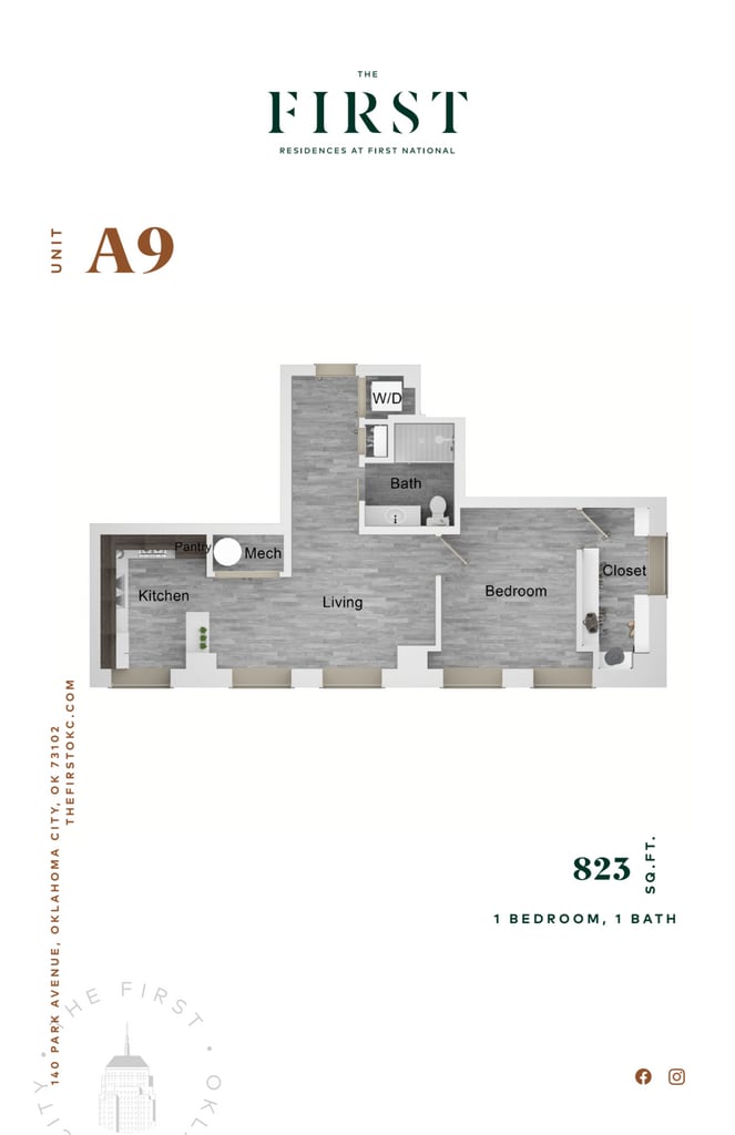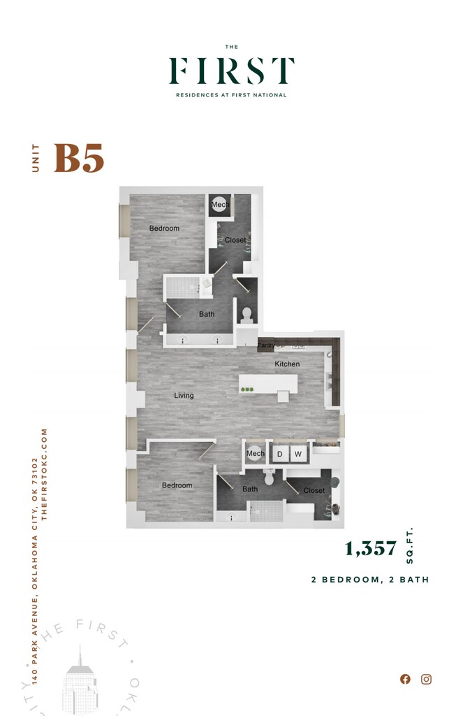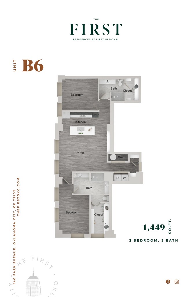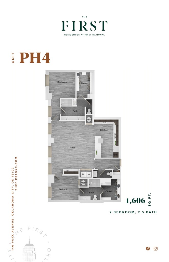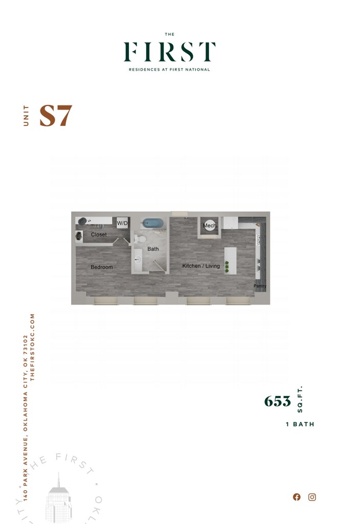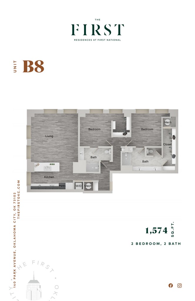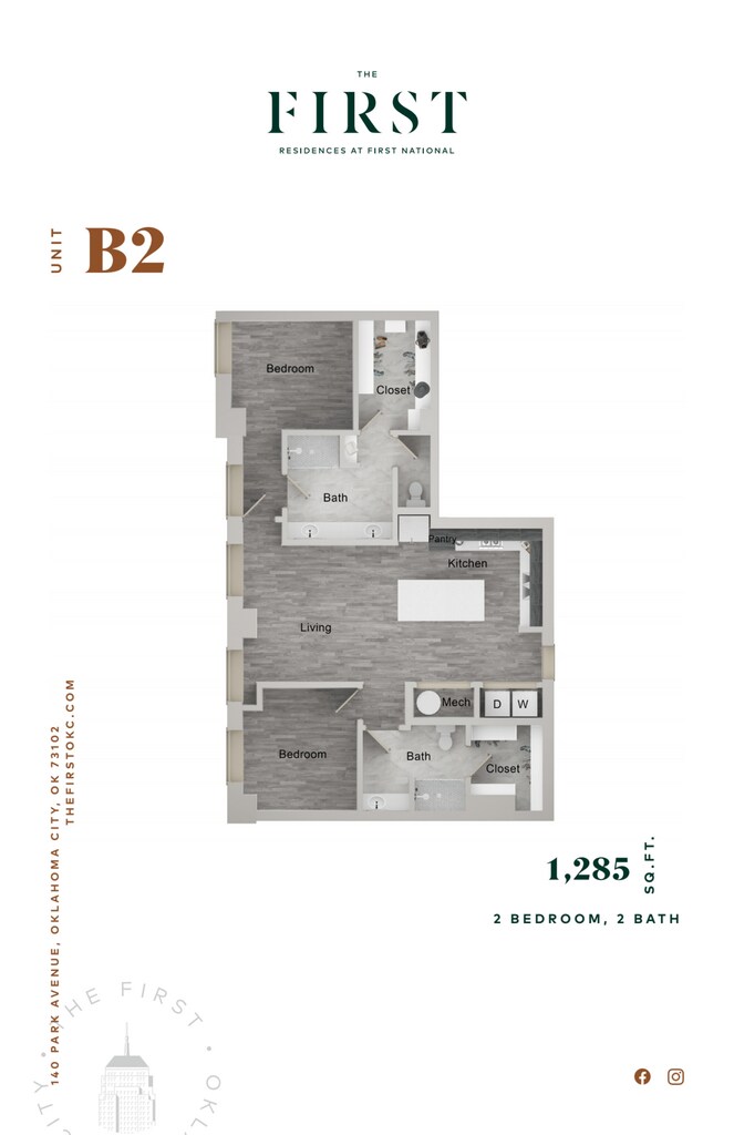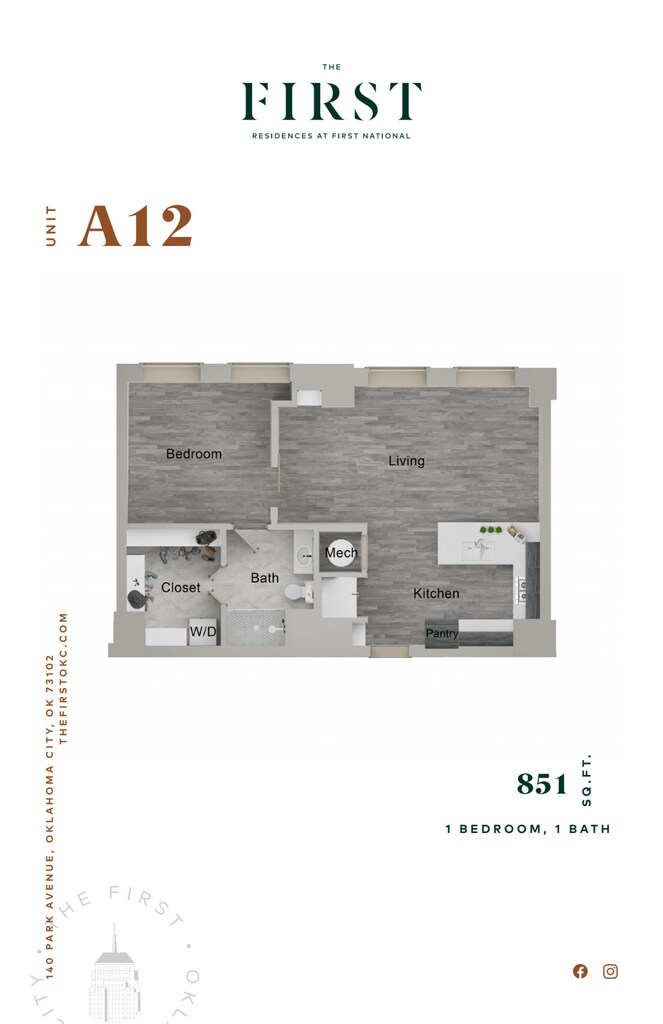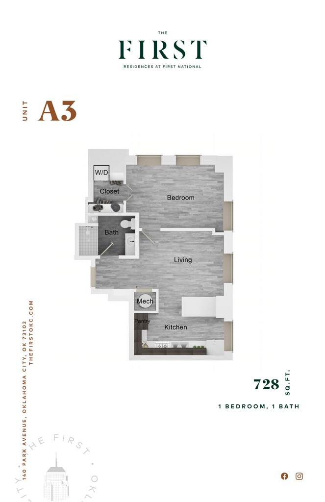The perfect living experience does exist at The First Residences in Oklahoma City, OK, where premium community amenities, spacious floorplans, and stylish interiors collide. At The First, we know how important comfort and convenience is to our residents. Our apartments are fit for every lifestyle, thanks to our spacious one- and two-bedroom units, studios, and penthouse floorplan options. From our resident-side amenity deck to the more than 1 million square feet of community and living space, The First brings history and luxury to life. Built upon luxury and sophistication, The First Residences are unlike any other apartments for rent in Oklahoma City. Art, history, and elegance combine to create an iconic living space in the heart of downtown. Articulately located within the First National Center, our opulent apartment homes are tied to the area’s rich history. Community Amenities: State-of-the-art fitness center, virtual fitness center, luxury hotel rooms for visitors, meeting rooms, gourmet restaurants, upscale bars, 14-story parking garage, high end shopping experiences, rooftop amenity deck with bark parks and seating, rooftop amenity deck with heated infinity pool*, cabanas, and outdoor kitchen, cyber lounge, social lounge, dog wash salon, valet & concierge services, short-term housing available, corporate housing available Residential Amenities: Over 1 million square feet of space, original marble in the front entry doors, spacious customizable walk-in closets, backlit LED vanity mirrors, latch keyless entry system, soft close cabinet doors and drawers, soft close toilet seats, dual climate control*, striking skyline views, roller shades ceiling fans in living room and bedroom(s), ceramic wood plank flooring, gourmet kitchen appliances, designer faucets, under mounted cabinet lighting, full size washer and dryer, stainless steel french door refrigerators, spa inspired walk-in showers