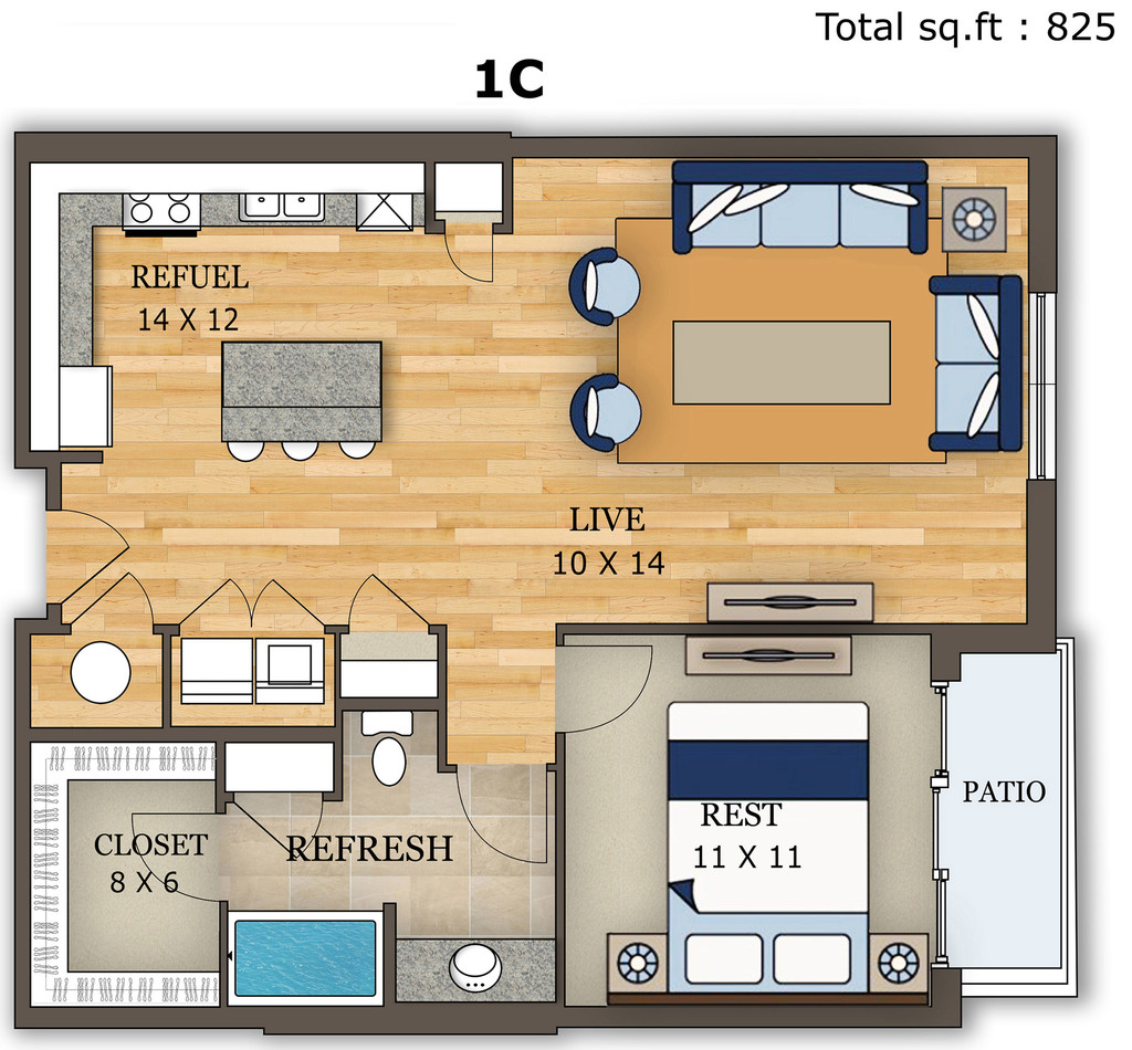 1 Bed, 1 Bath, 825 sq ftModel Gallery