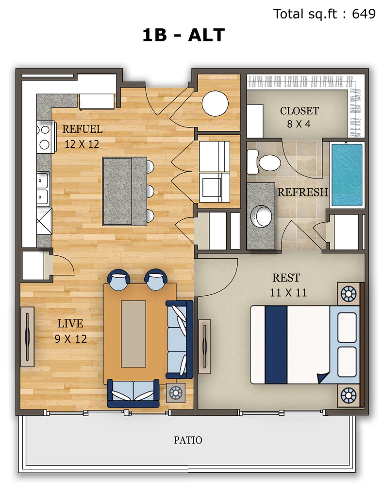 Apartment Model: 1B-ALT1 Bedroom, 1 Bath, 649 sq ftUnavailable![]()