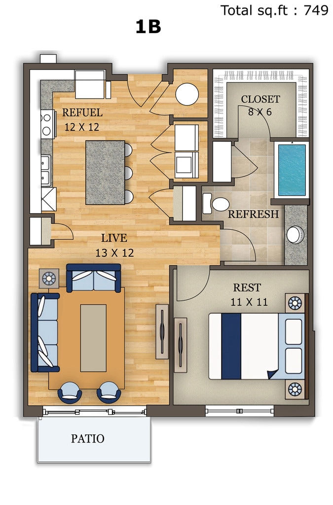 Apartment Model: 1B1 Bedroom, 1 Bath, 749 sq ftUnavailable![]()