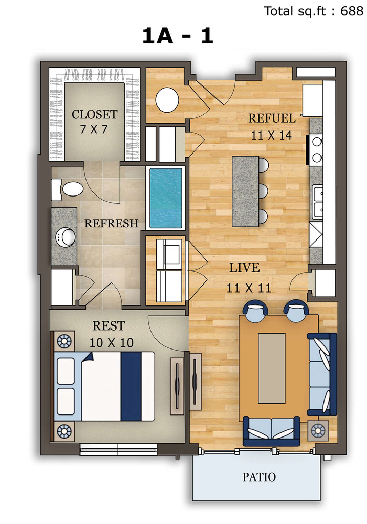 Apartment Model: 1A-11 Bedroom, 1 Bath, 688 sq ftUnavailable![]()