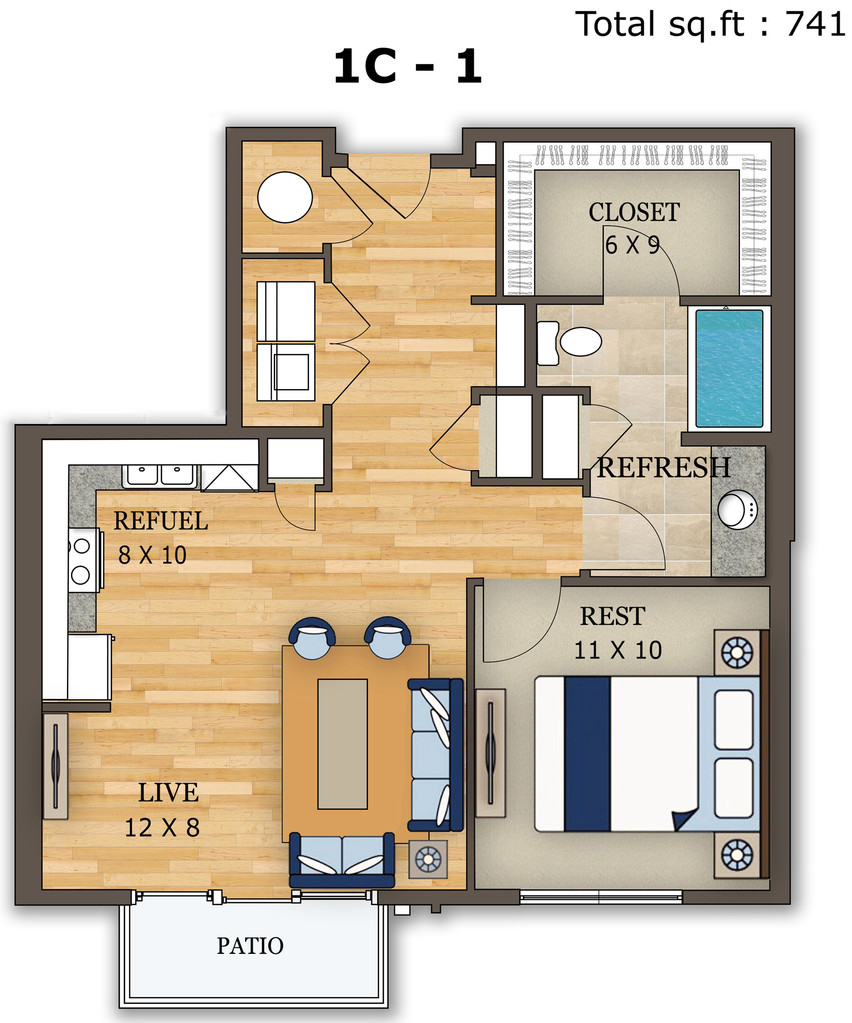 Apartment Model: 1C-11 Bedroom, 1 Bath, 741 sq ftUnavailable![]()