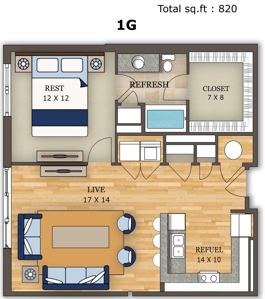 Apartment Model: 1G1 Bedroom, 1 Bath, 820 sq ftUnavailable![]()