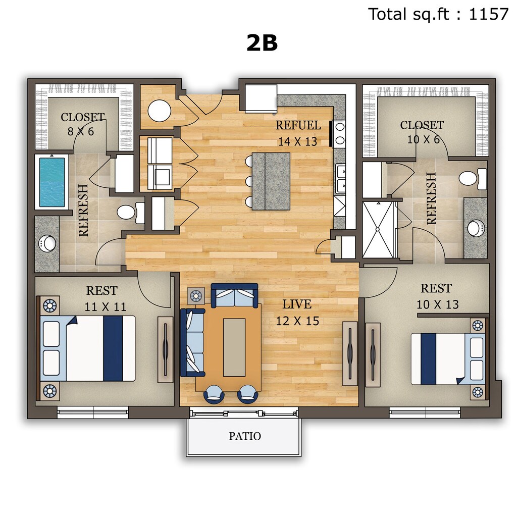Apartment Model: 2B2 Bedroom, 2 Bath, 1157 sq ftUnavailable![]()