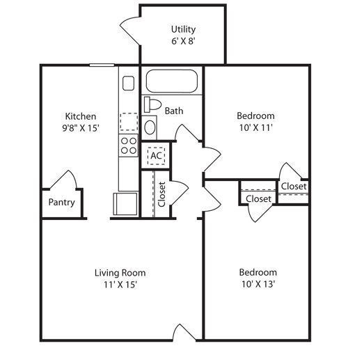 Apartment Model: 2 Bedroom 1 BathCall For Rates2 Bedroom, 1 Bath, 910 sq ftFloorplansPhotos![]()