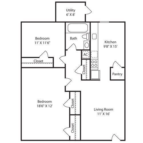 Apartment Model: 2 Bedroom 1 Bath$6452 Bedroom, 1 Bath, 648-672 sq ftAvailable NowFloorplansPhotos![]()
