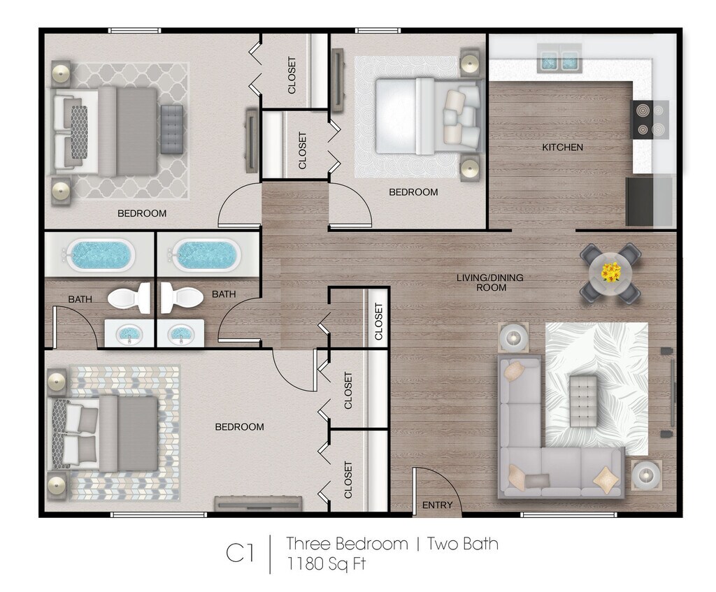 3 Beds, 2 Baths, 1180 sq ftModel Gallery