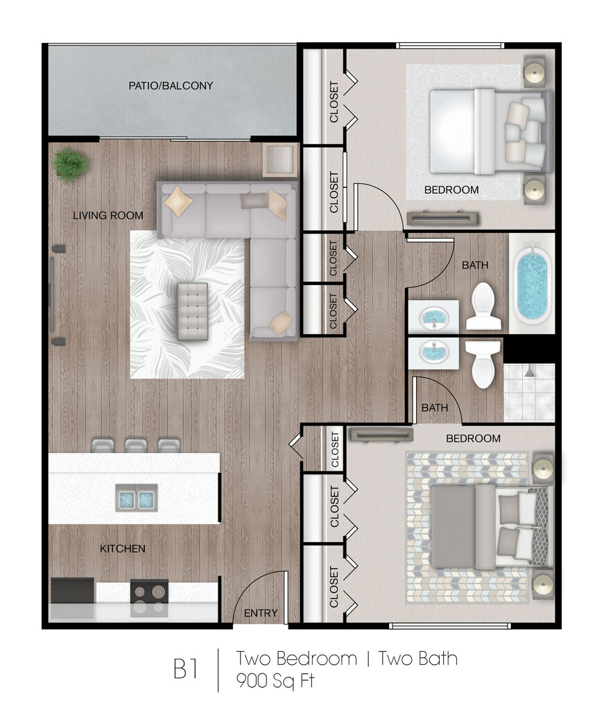 2 Beds, 2 Baths, 900 sq ftModel Gallery