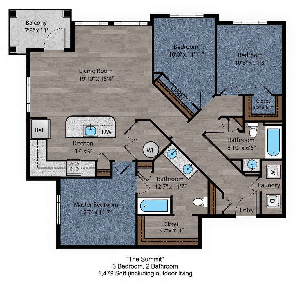 1 Bedroom to 3 Bedroom Apartments at The Flats at Summit Station currently range from $1,465 to $2,090