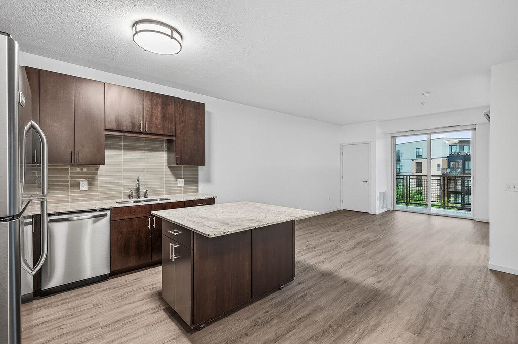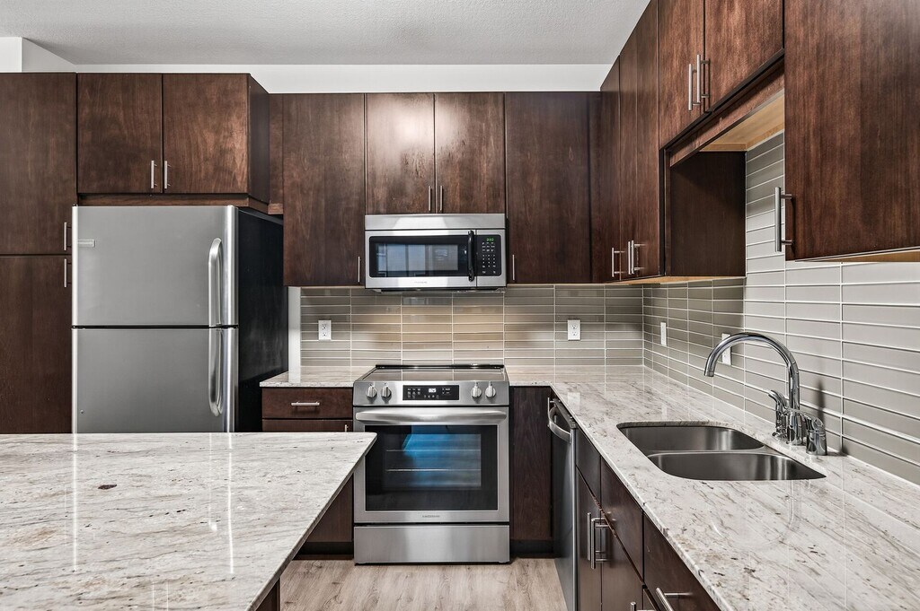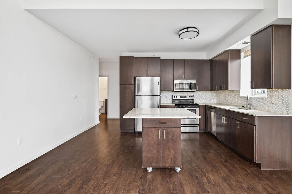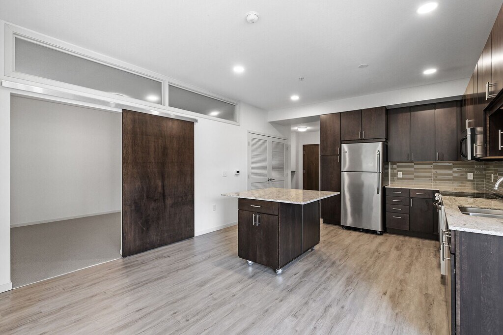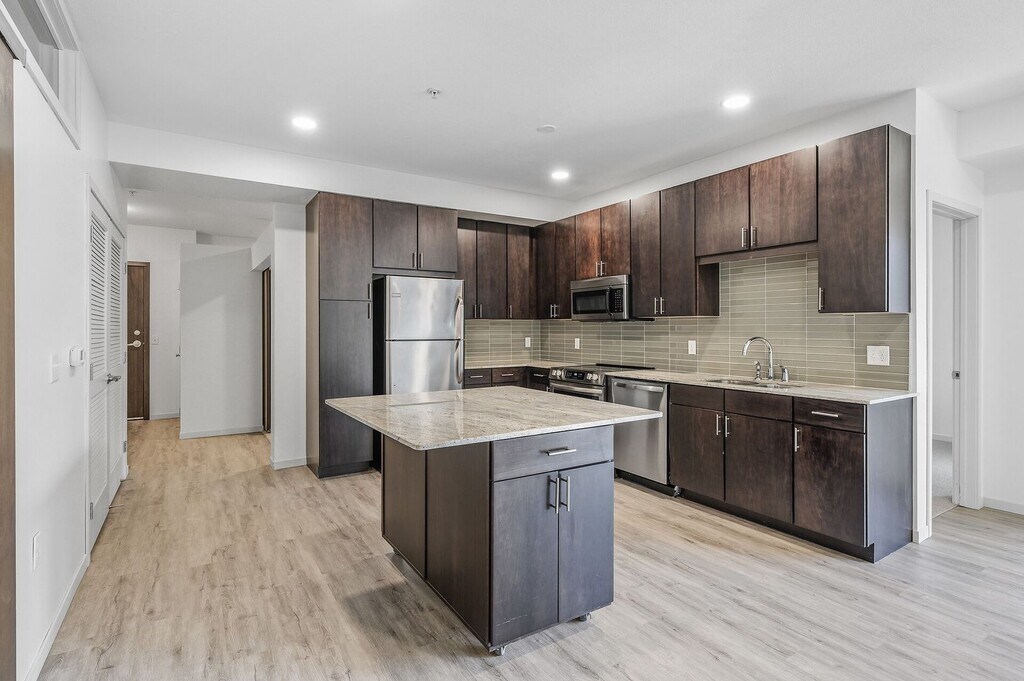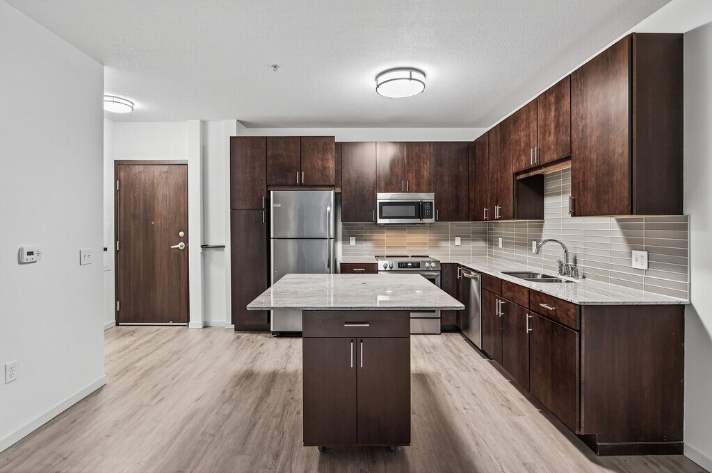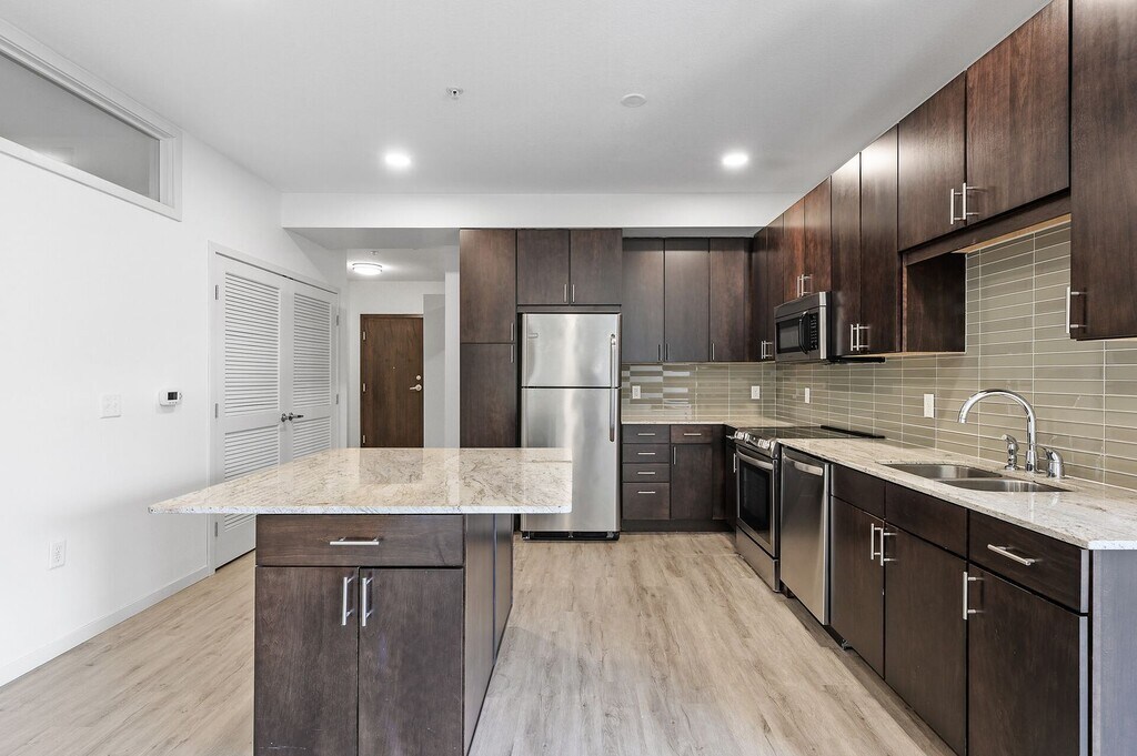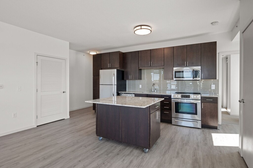 Experience contemporary luxury in this thoughtfully designed apartment, where sleek finishes and modern conveniences create the perfect place to call home. The open-concept kitchen is a statement of style and functionality, featuring rich espresso cabinetry, striking glass-tile backsplash, gleaming granite countertops, and a spacious kitchen island—perfect for cooking, entertaining, or casual dining. The high-end premium appliances package completes the space, blending seamlessly with the modern aesthetic. The sophistication continues with soft grey luxury vinyl plank flooring, offering both durability and elegance. Upgraded LED lighting enhances the ambiance, creating a bright and inviting atmosphere. Step into the airy living space, which flows effortlessly to a private east facing facing balcony, providing the perfect retreat for morning coffee or evening relaxation. Designed for effortless living, this apartment includes a walk-in bedroom closet for optimal storage and a stacked washer and dryer for ultimate convenience. Every element has been curated for modern comfort and timeless elegance. Don’t miss the chance to experience this elevated living space—schedule a tour of the Harley Modern Flat today!