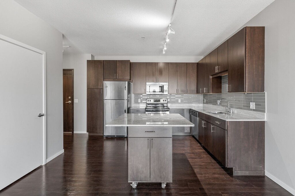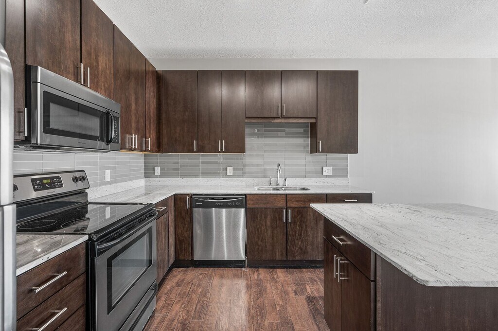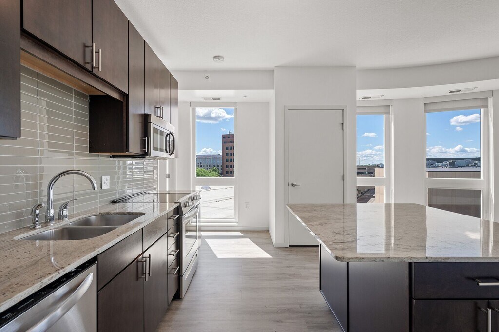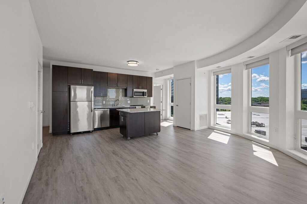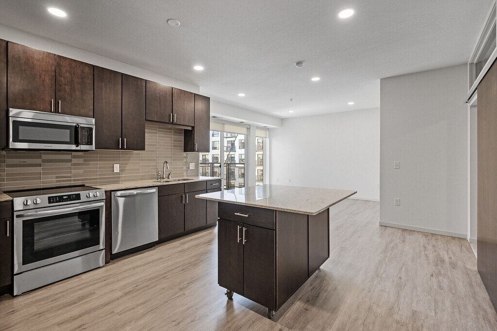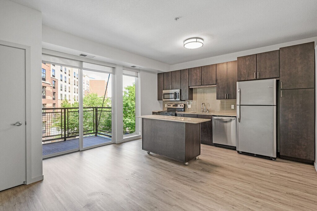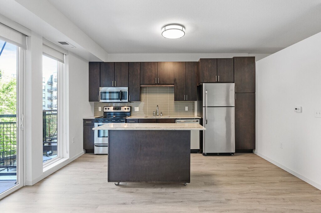 Experience contemporary luxury in this thoughtfully designed apartment, where sleek finishes and modern conveniences create the perfect place to call home. The open-concept kitchen is a statement of style and functionality, featuring rich espresso cabinetry, striking glass-tile backsplash, gleaming granite countertops, and a spacious kitchen island—perfect for cooking, entertaining, or casual dining. The high-end premium appliances package completes the space, blending seamlessly with the modern aesthetic. The sophistication continues with soft grey luxury vinyl plank flooring, offering both durability and elegance. Upgraded LED lighting enhances the ambiance, creating a bright and inviting atmosphere. Step into the airy living space, which flows effortlessly to a private northeast facing balcony, providing the perfect retreat for morning coffee or evening relaxation. Designed for effortless living, this apartment includes a custom-built bedroom closet for optimal storage and a stacked washer and dryer for ultimate convenience. Every element has been curated for modern comfort and timeless elegance. Don’t miss the chance to experience this elevated living space—schedule a tour of the Harley Modern Flat today!