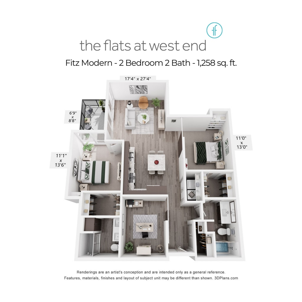 The Flats at West End offers 1 to 2 Bedroom apartments starting from $1,625 and having 539–1,258 sq ft. Here is the current pricing and availability: