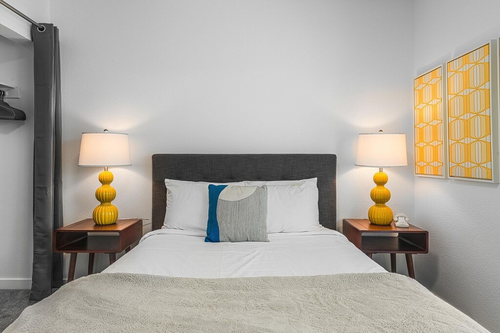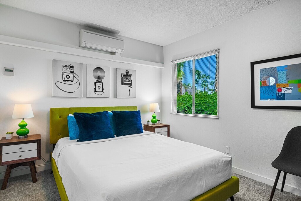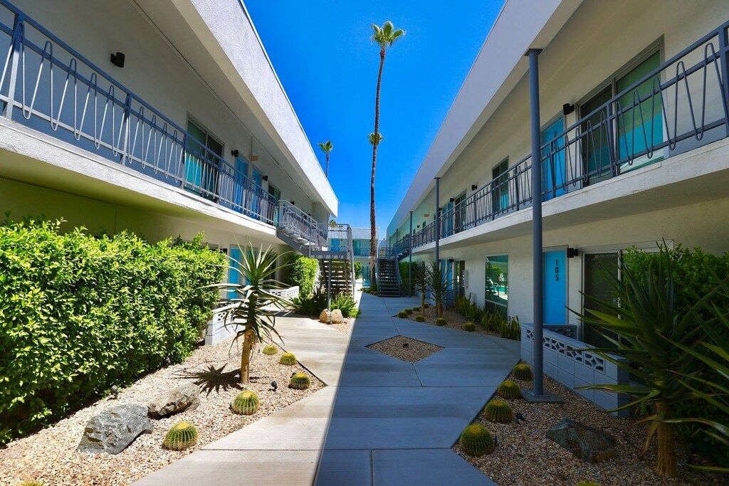 The Float is a Mid-Century Modern building located in the Deepwell Section of South Palm Springs, where convenience meets style! This is a Two-bedroom, one-bath furnished unit. Newly renovated furnished units with views of the San Jacinto mountains. Walk or bike to popular restaurants and shops in the Smoke Tree Village Shopping Center. Ralph's supermarket, Koffi, Smokin' Burgers, Elmer's, banking, shopping and fast food restaurants are all within a short 5 minute walk. The kitchen: Modern style with plenty of cabinetry. Appliances include a built-in microwave, dishwasher, refrigerator, and gas range. A faux metal backsplash compliments the stainless steel appliances. The bathroom: Modern, sleek, and clean looks. Bathtub/shower features faux metal walls to tie in with the kitchen backsplash. Each unit has new energy efficient European-style mini-split heating and A/C system. A communal washer and dryer are just steps away. Relax by the glistening blue pool under vibrant blue umbrellas and green palm trees with San Jacinto mountain views. A building brought into the present with modern features, but with history as 1950's Hillcrest Manor. Each unit offers uncompromising style and flair having been reinterpreted by Palm Springs’ acclaimed H3K design team.