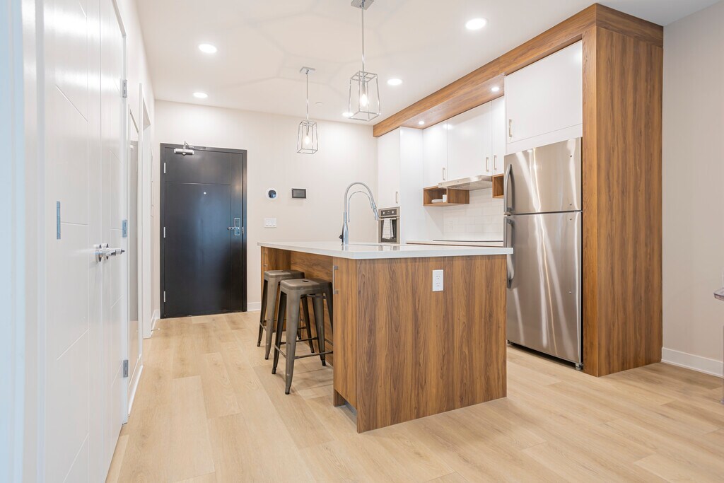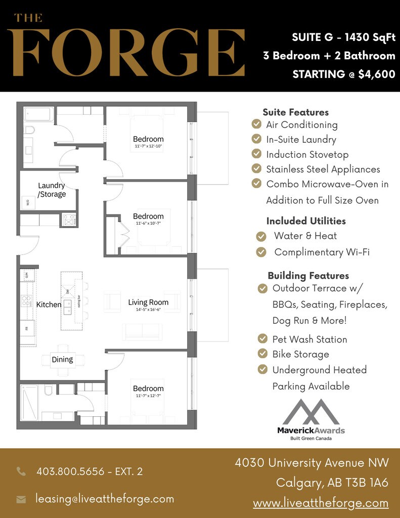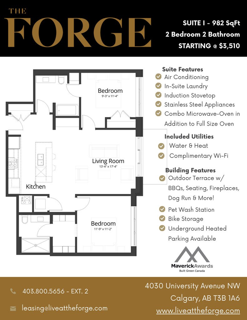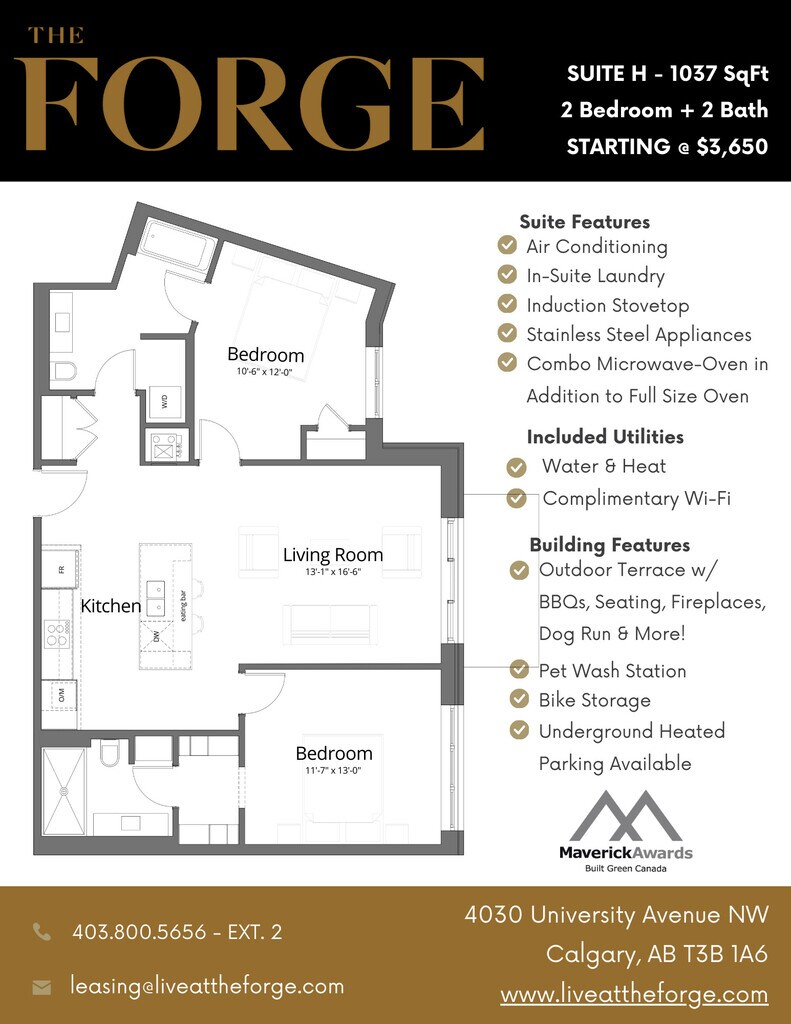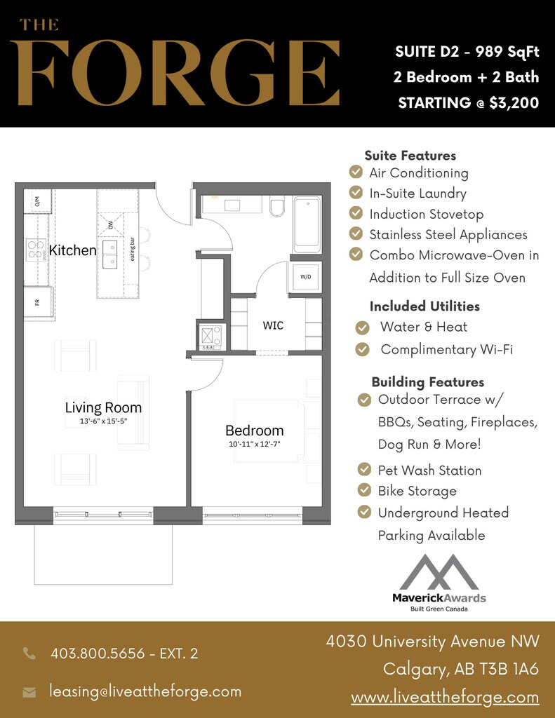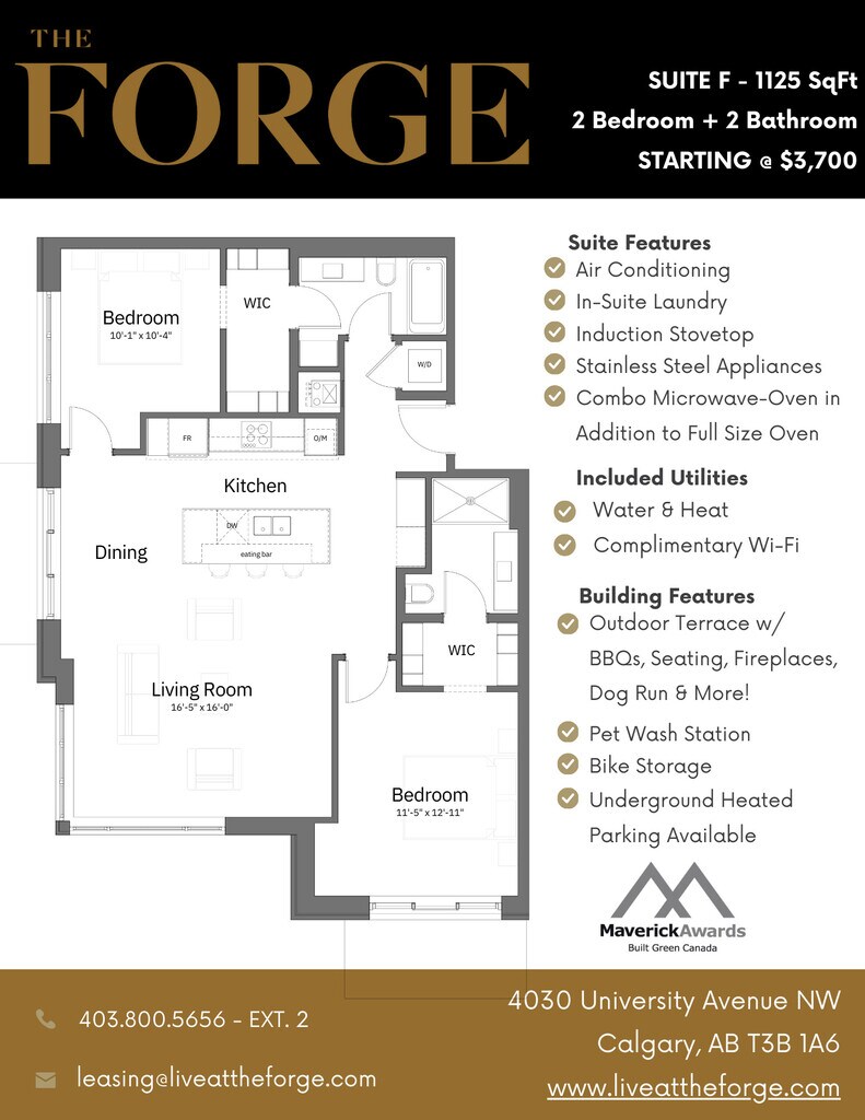 The Forge in University District is a 92-suite luxury pet friendly apartment building located in Northwest Calgary. Built to incorporate ecofriendly, environmentally-sound, and repurposed materials whenever possible. Every suite is equipped with high-end finishes, private balconies, and high-efficiency appliances and offers a large outdoor 2nd floor terrace with barbeques, a fireplace, and a pergola with ample seating, as well as being only steps away from everything you could ever need, The Forge is the ideal place to call home! With a full concrete structure, each suite and floor is enveloped in insulation to reduce sound, keep cool in the summer and warm in the winter. Electric car stations and caged bike storage in our underground parkade make being green living easy. The 2nd floor terrace is a place for gathering and a connection to diverse amenities. With a large dog run, barbeque grills, comfy patio seating and game area, you may find yourself in this space more than in your suite. Located amidst The Canadian Brewhouse, Cineplex, Shoppers Drug Mart and Save-On-Foods, you won’t have to go far to experience life outside your suite. Breeze across the street with your little ones to Clever Daycare, open 24 hours a day, 7 days a week. Pop-up markets, festivals, human and pet meet-ups happen all along the main street, University Avenue, where The Forge is centrally situated.