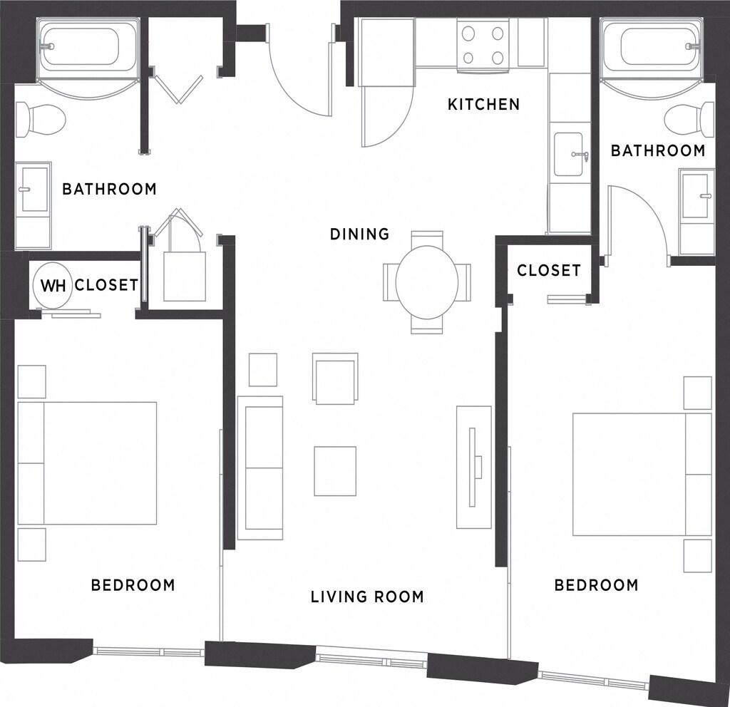 2BR x 1BA - Floorplan 4 Apartment Unit: 620Apartment Model: 2BR x 1BA2 Bedroom, 1 Bath, 850 sq ftAvailable Now![]()
