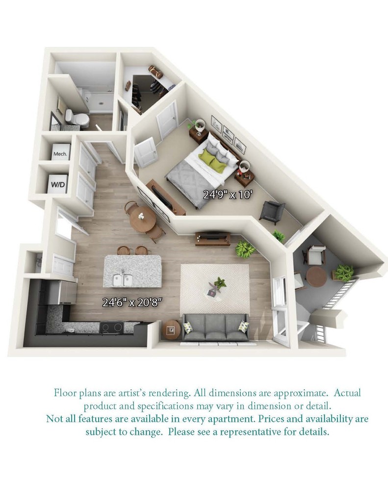 Apartment Model: A3$1,4101 Bedroom, 1 Bath, 724 sq ftAvailable NowFloor plans are artist's rendering. All dimensions are approximate. Actual product and specifications may vary in dimension or detail. Not all features are available in every rental home. Prices and availability are subject to change. Base rent is based on monthly frequency. Additional fees may apply, such as but not limited to package delivery, trash, water, amenities, etc. Deposits vary. Please see a representative for details.