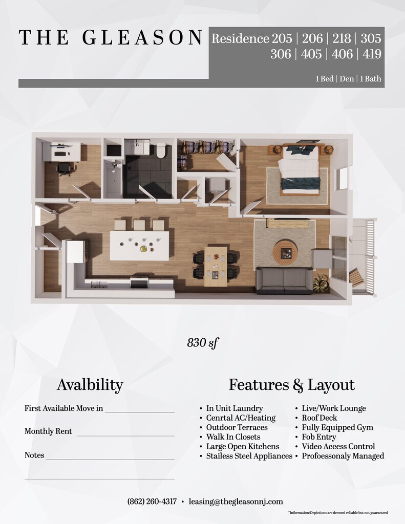 The Gleason offers 1 to 2 Bedroom apartments starting from $3,195 and having 830–1,239 sq ft. Here is the current pricing and availability: