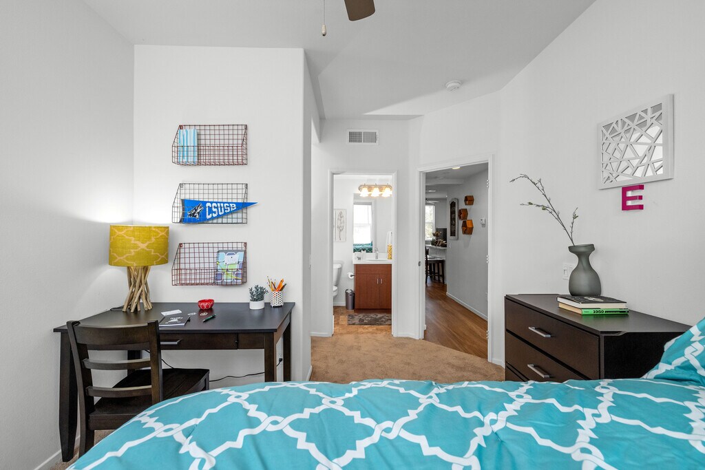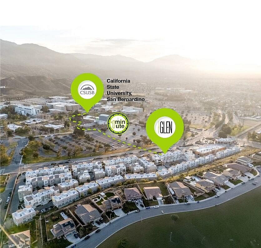 When you are looking for housing in San Bernardino, there is no better option than The Glen. Here, you will not find just another student apartment, but your new home. With a variety of 5 bedroom layouts, gourmet kitchens, full-size washers and dryers, and private bathrooms, The Glen is more up-scale social living than traditional student housing. And our designers have added plenty of simple but modern finishes to make your apartment feel more comfortable including, personal garages, hardwood-style flooring, and granite countertops. So spend an evening relaxing, and grilling with friends at The Glen. Plus, our location to CSUSB is something to brag about! Located directly across the street and just steps away from CSUSB, rooms for rent at The Glen are at the center of it all. Enjoy luxurious amenities and open floorplans with low monthly rates! At The Glen, you will experience the best student housing that San Bernardino has to offer! Live right next to campus while still having the freedom of an off-campus lifestyle and access to on-property retail stores. Live the best life possible during your time at CSUSB with The Glen!