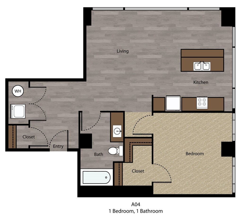 A08 - Floorplan 1 Apartment Unit: 0402Apartment Model: A081 Bedroom, 1 Bath, 965 sq ftAvailable NowPenthouse B