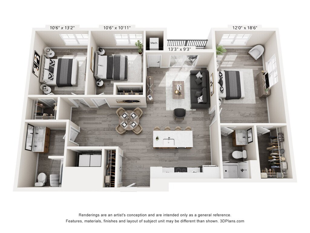 Apartment Model: The GalleryFrom $2,4953 Bedroom, 2 Bath, 1392 sq ftAvailable May 1, 2026Floor plans are artist's rendering. All dimensions are approximate. Actual product and specifications may vary in dimension or detail. Not all features are available in every rental home. Please see a representative for details.
