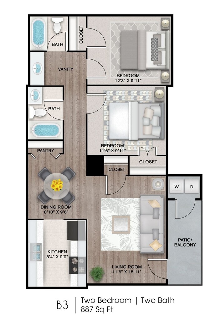2 Beds, 2 Baths, 887 sq ftModel Gallery