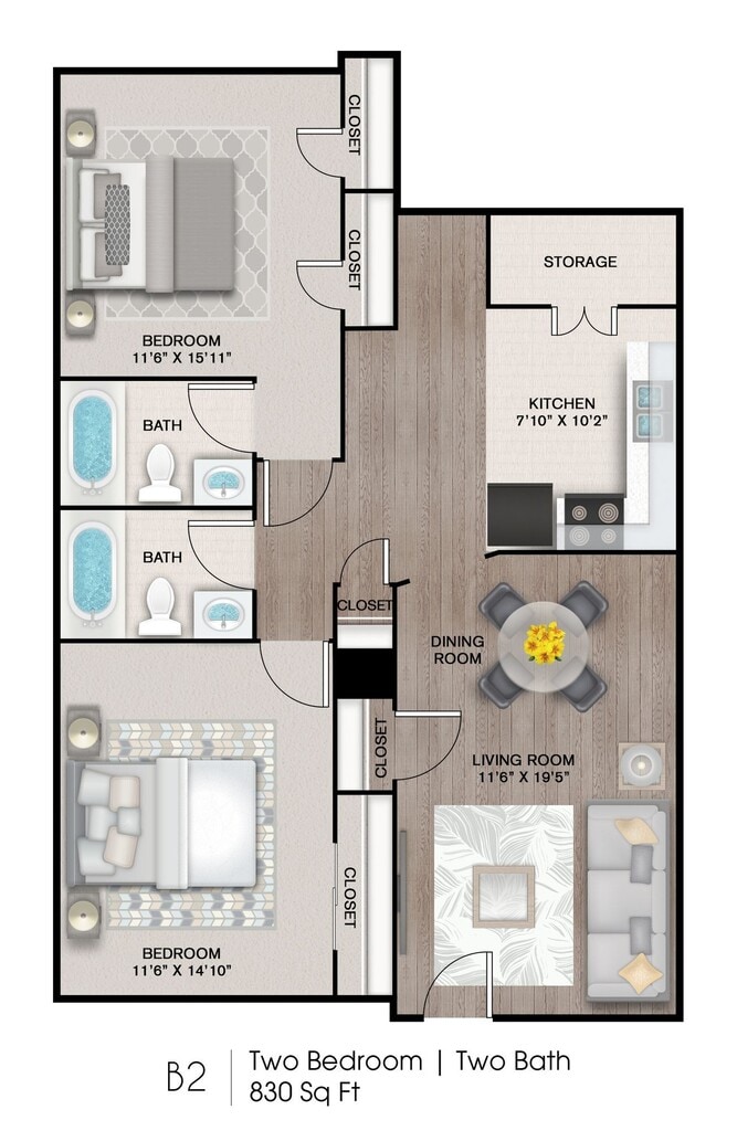2 Beds, 2 Baths, 830 sq ftModel Gallery