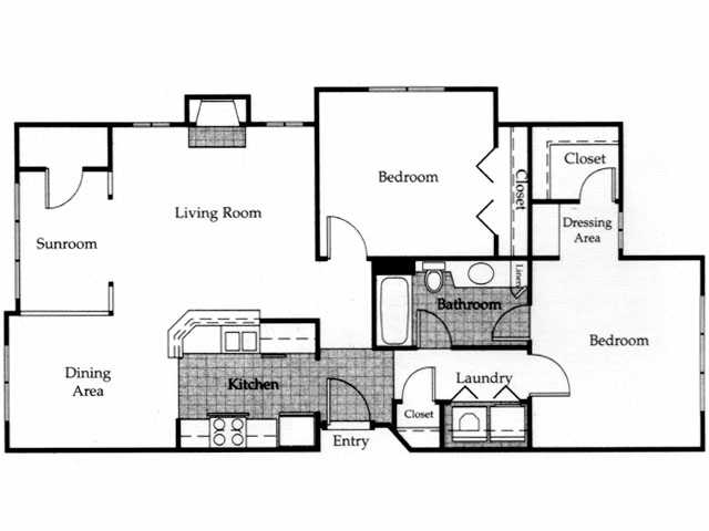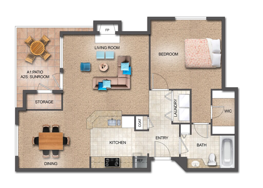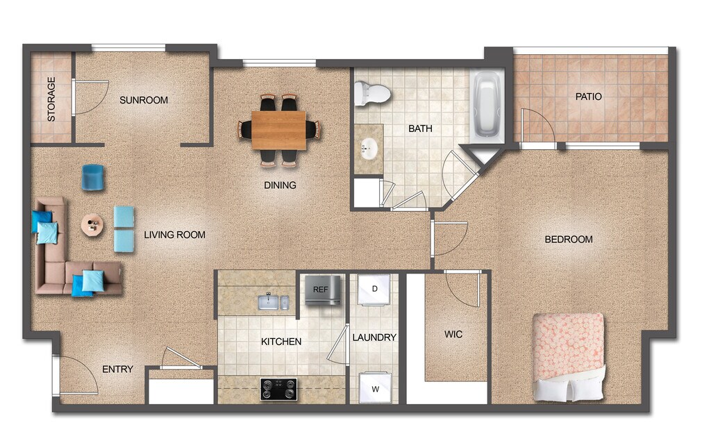 1 Bedroom w/Sunroom and Patio - Floorplan 1 2 Bedrooms