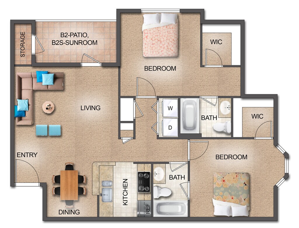 Apartment Model: 2 BedroomFrom $1,1052 Bedroom, 2 Bath, 1018 sq ftAvailable Now![]()