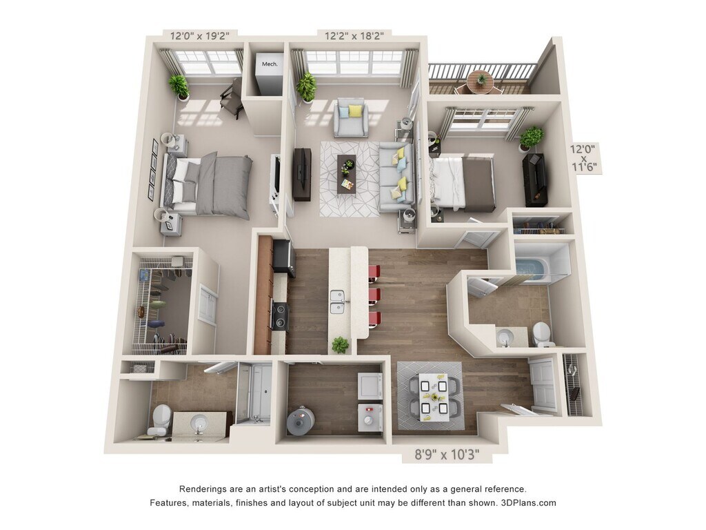 Apartment Model: 1 Bedroom 2 Baths with Den - 1208$1,9951 Bedroom, 2 Bath, 1208 sq ftAvailable January 15, 2026![]()